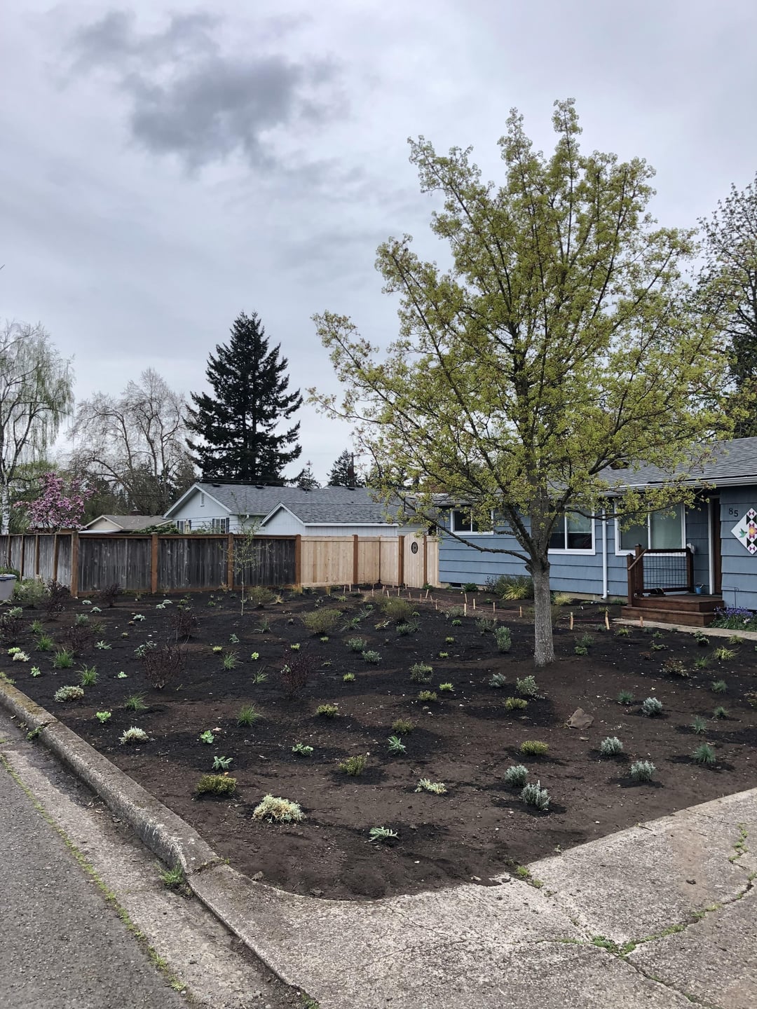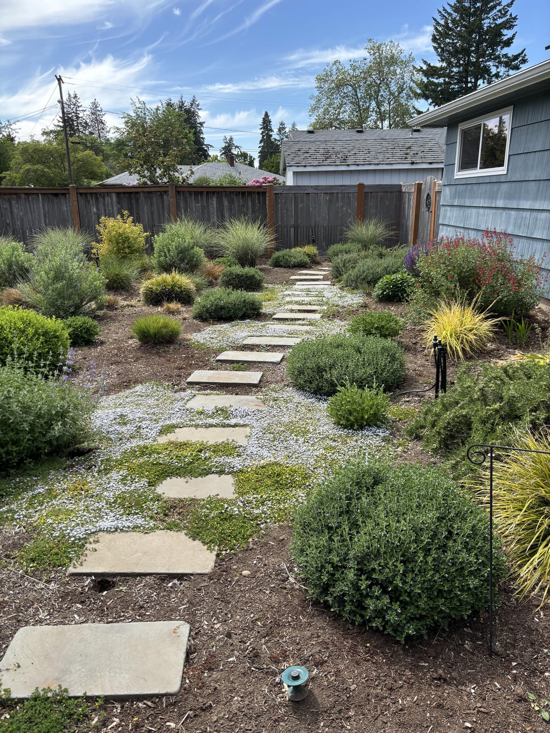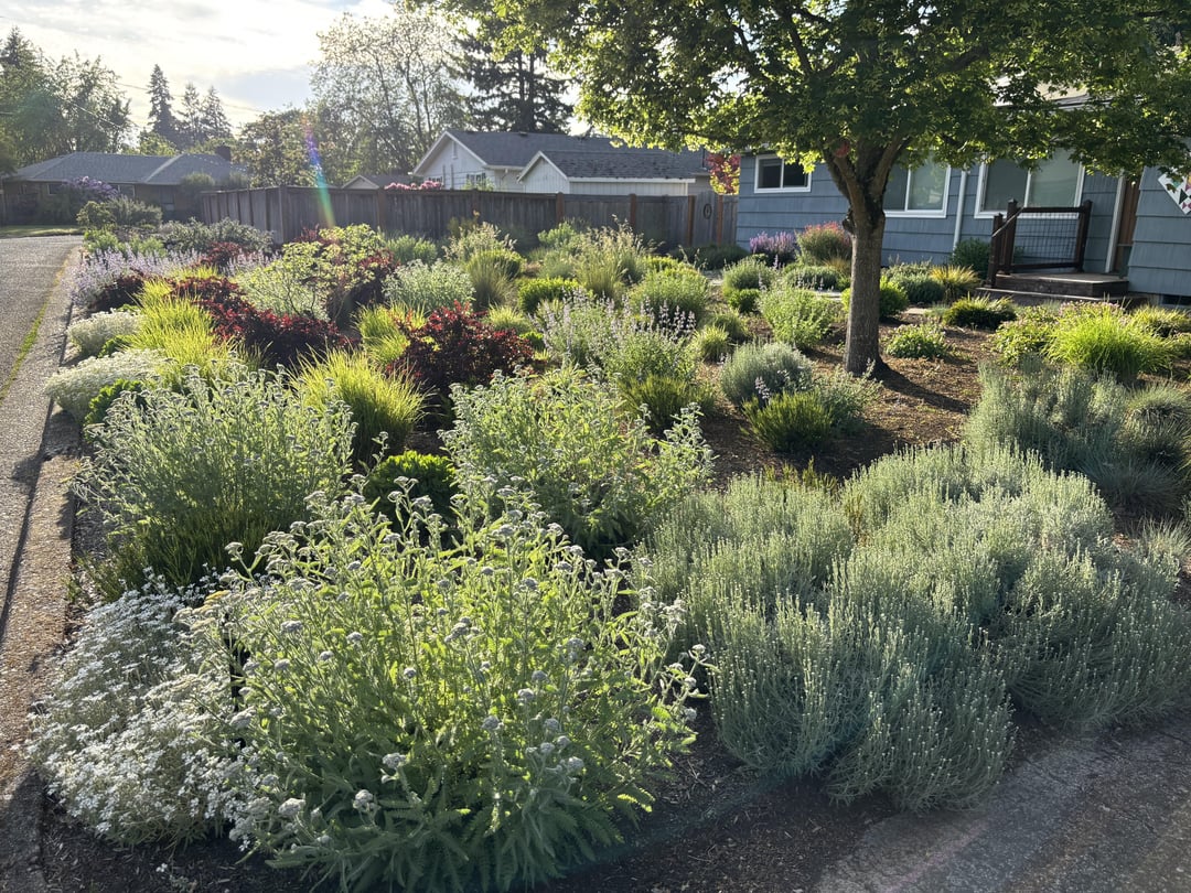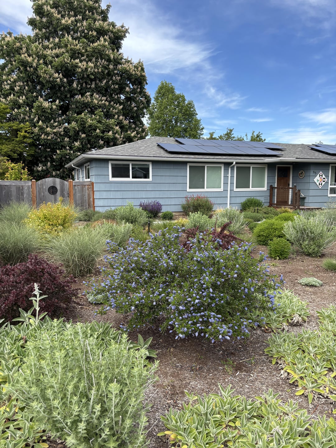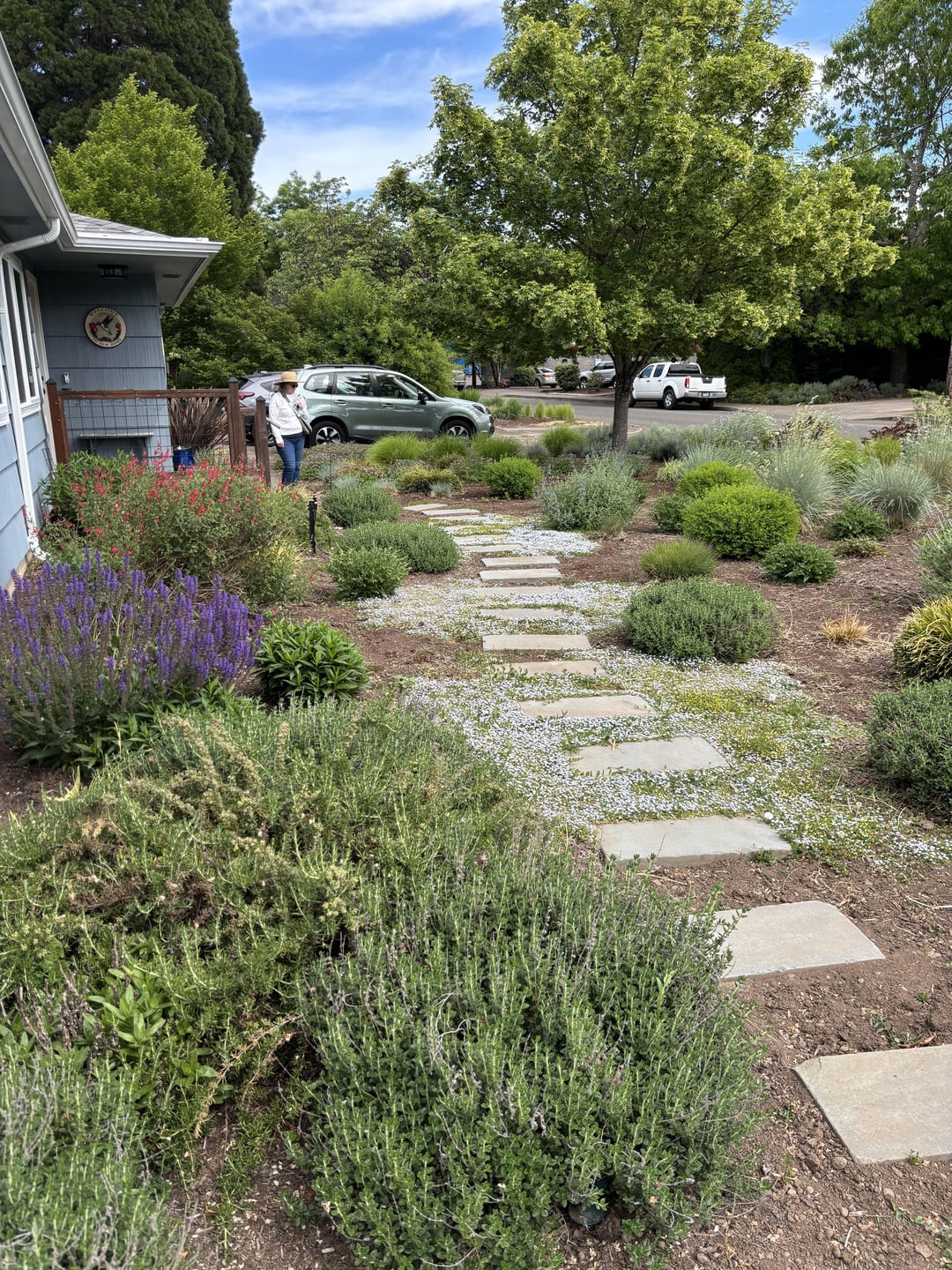 This was a project we started 3 years ago with the removal of our large law. We used a sod cutter and spent a week hauling the rolls of sod with a rented pickup truck to our local yard debris recycling center. Then we consulted a landscaper for inspiration for our landscape which we wanted to be drought tolerant and pollinator friendly. We love how it turned out and so does the neighborhood and the bees.