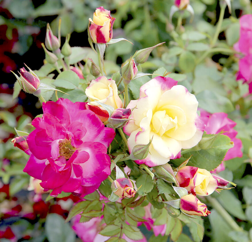Part of the Canadian Artist Series, this cold-hardy floribunda provides a multicolor display. Red and yellow buds open into deep, rose-edged, golden yellow flowers that mature to pink and ultimately cream.