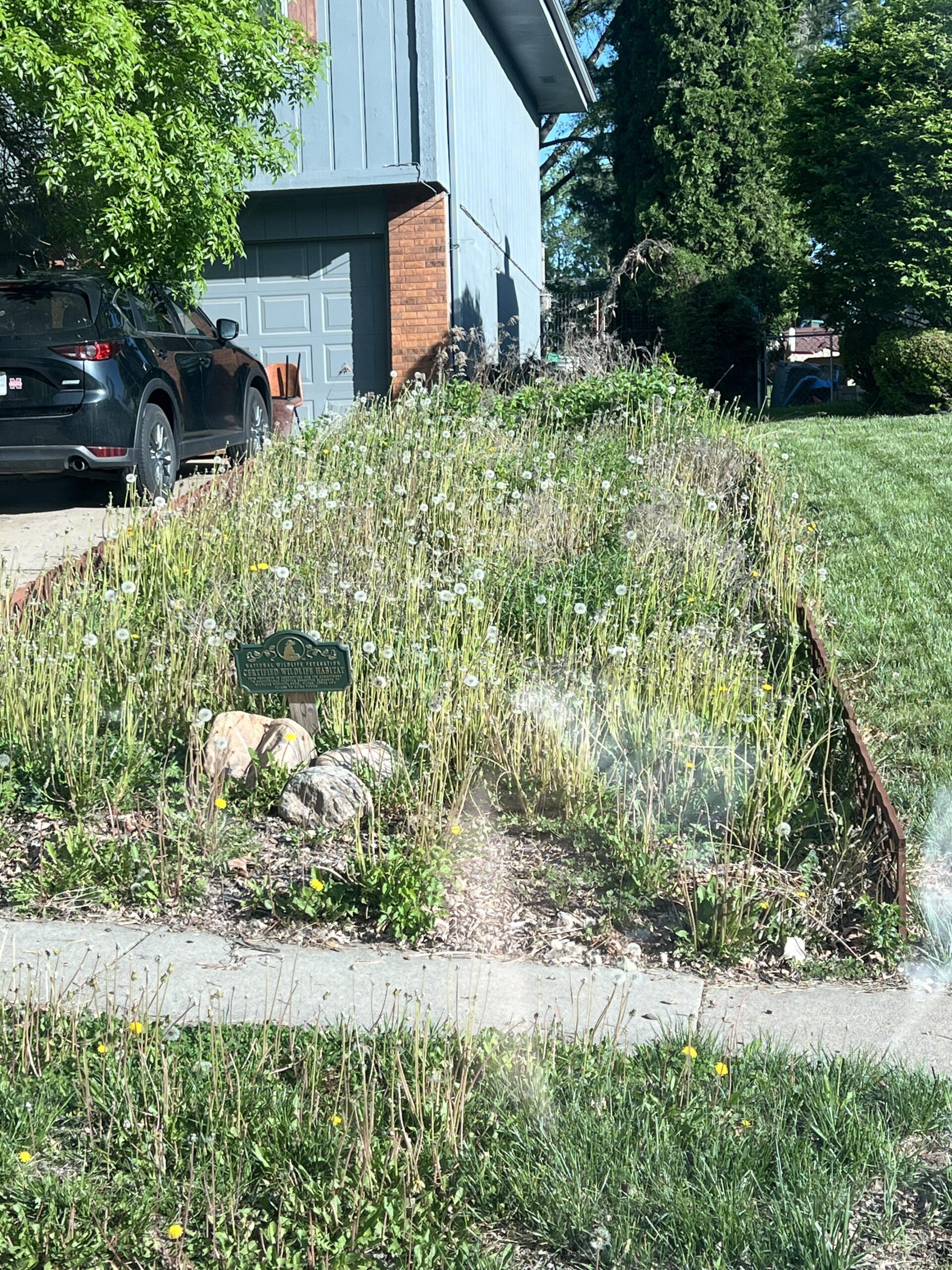 As an active no-lawn person – I hate this so much. It just looks like a messy, untended, disaster. This is someone who just stopped trying. They didn’t plan a no-lawn lawn. They didn’t research natives and get flowers that grow in the region. They just stopped mowing (and there is plenty of grass mixed in with those dandelions). A mess like this is what gives the no-lawn movement a bad name. As a neighbor I would be pissed about this unsightly mess.