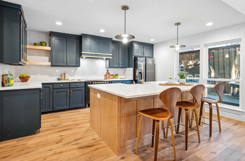 The current owners dramatically transformed the exterior and interior, reimagining the floor plan to maximize utility and aesthetics. The kitchen was originally at the front of the house, which nixed any possibility of the kind of open floor plan everyone loves today. So the owners made a bold decision to relocate the kitchen, moving it to the back of the house to create that open space. The original kitchen area became a cozy, peaceful home office overlooking the park. It’s a much more sensible, livable, and stylish arrangement.