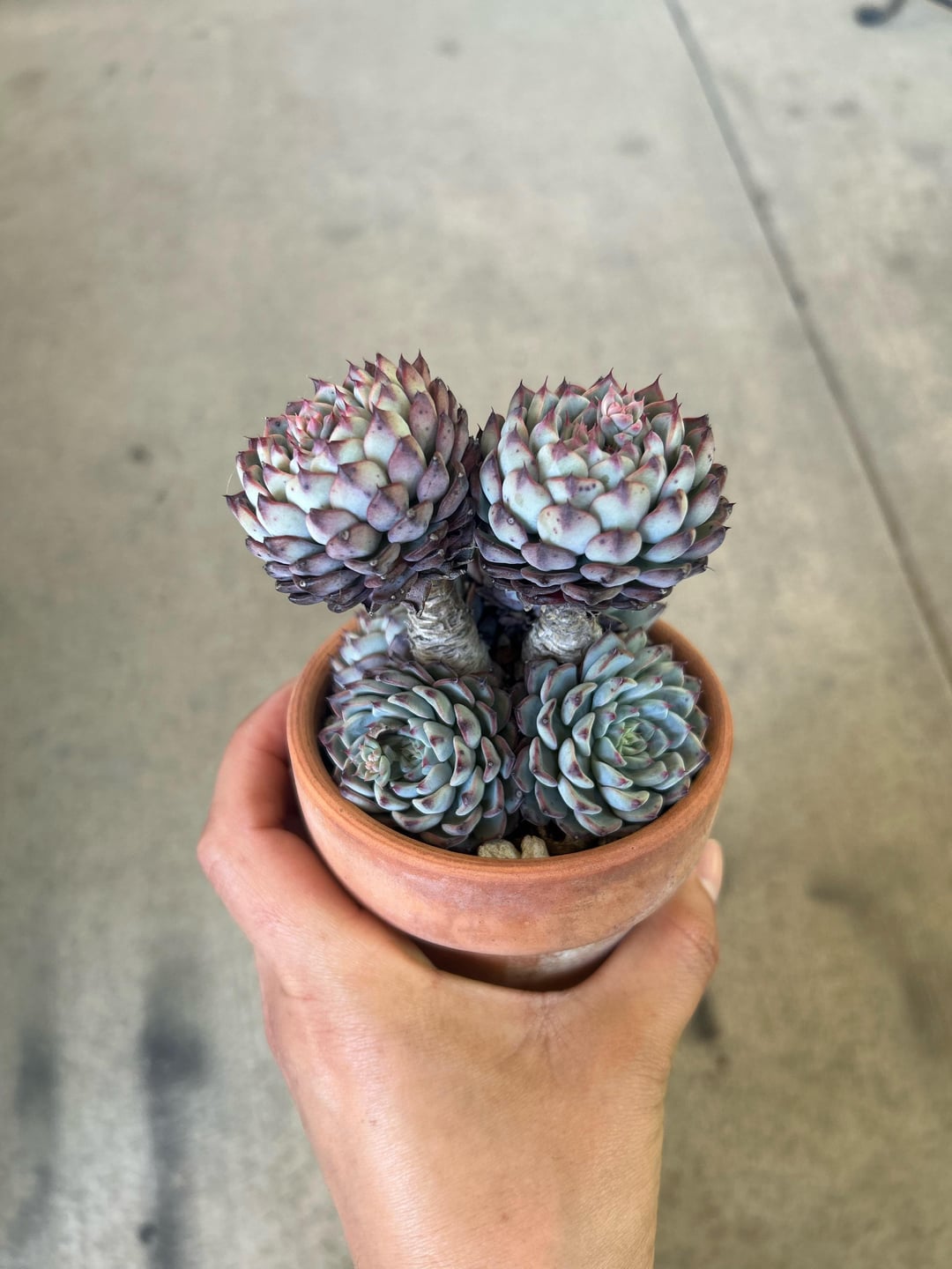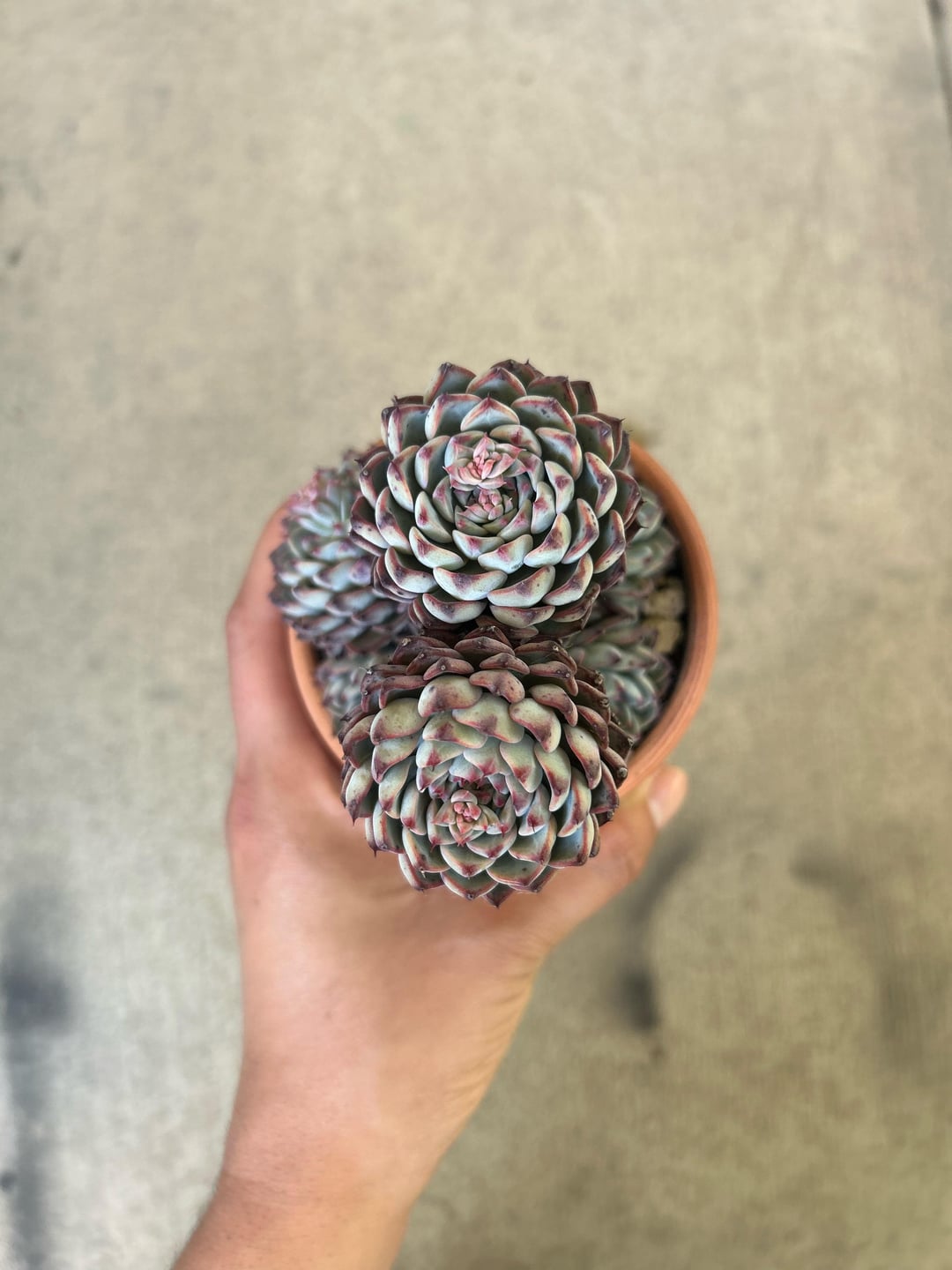 This echeveria is overdue for a repot; the pups are crowded and overflowing. However the plant is about to shoot off some blooms. Should I just wait till after the blooms? Or will it not affect much? If you have an I.D. that’d be helpful too haha 😅