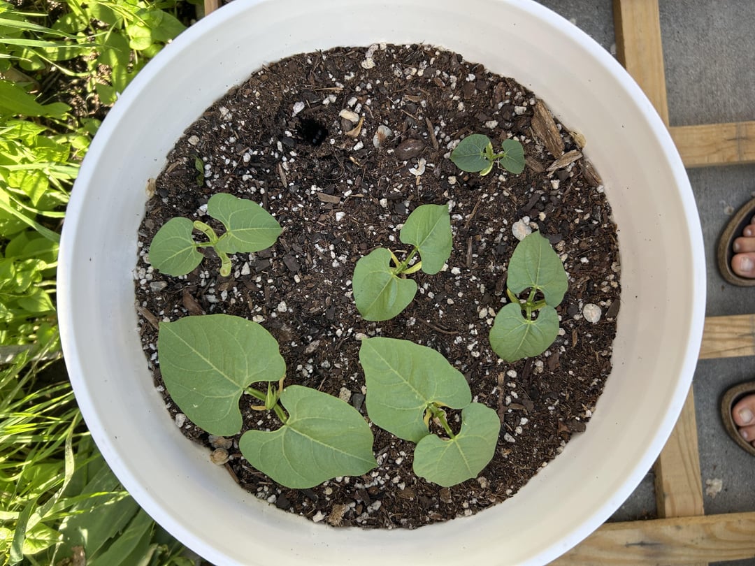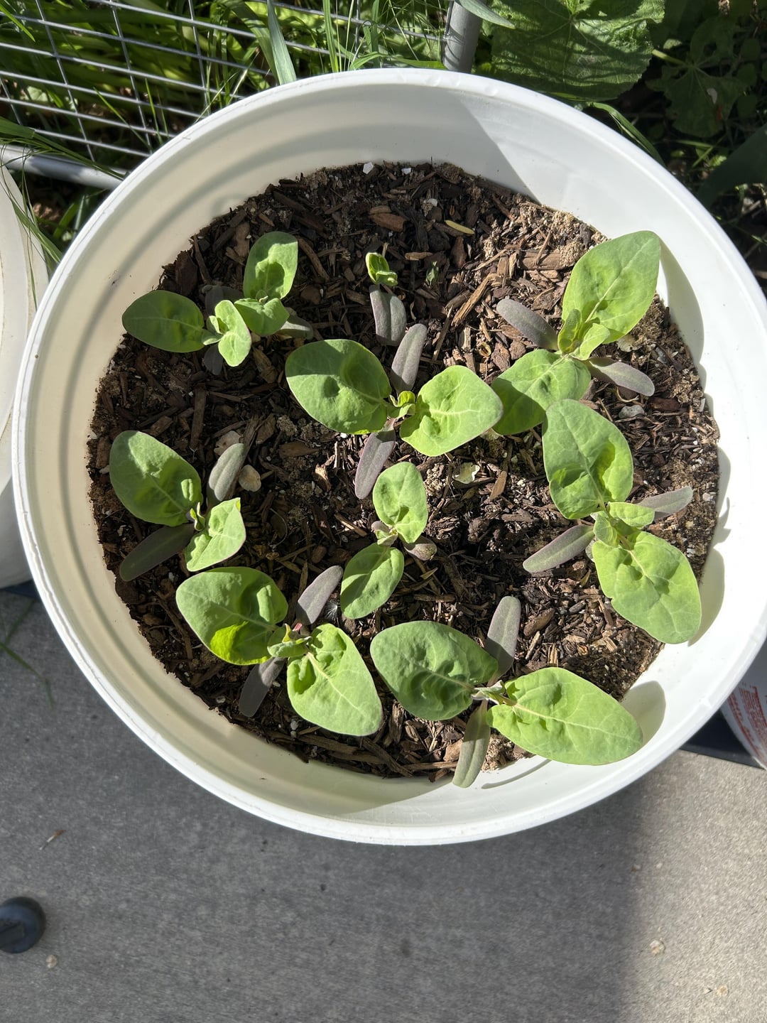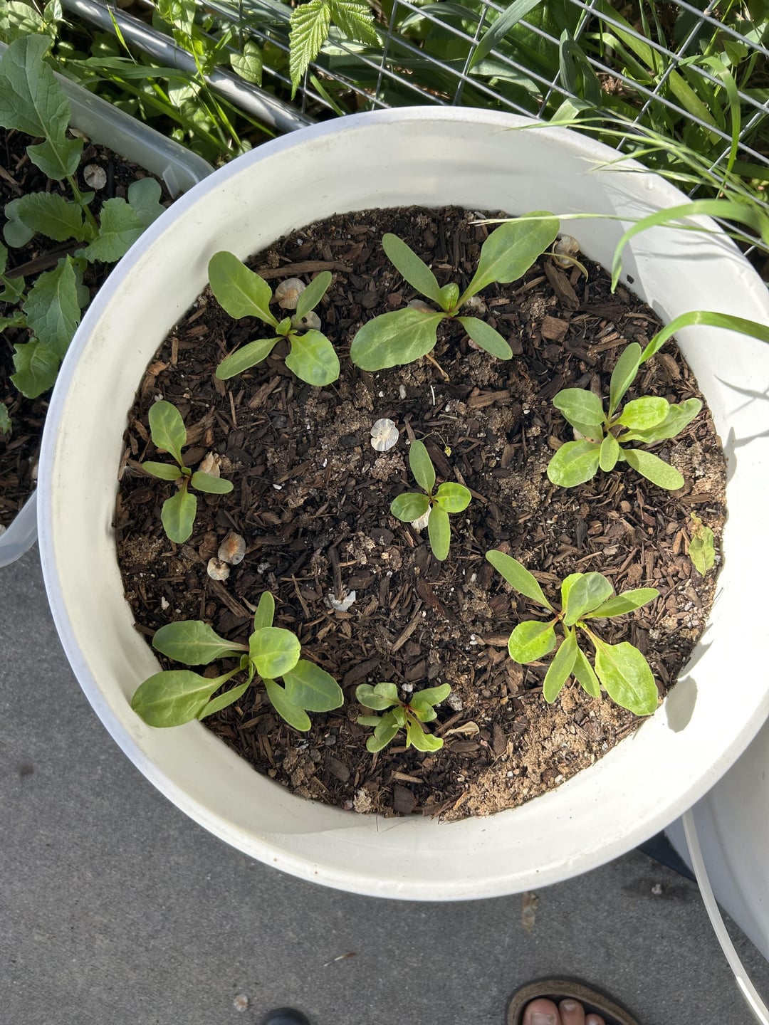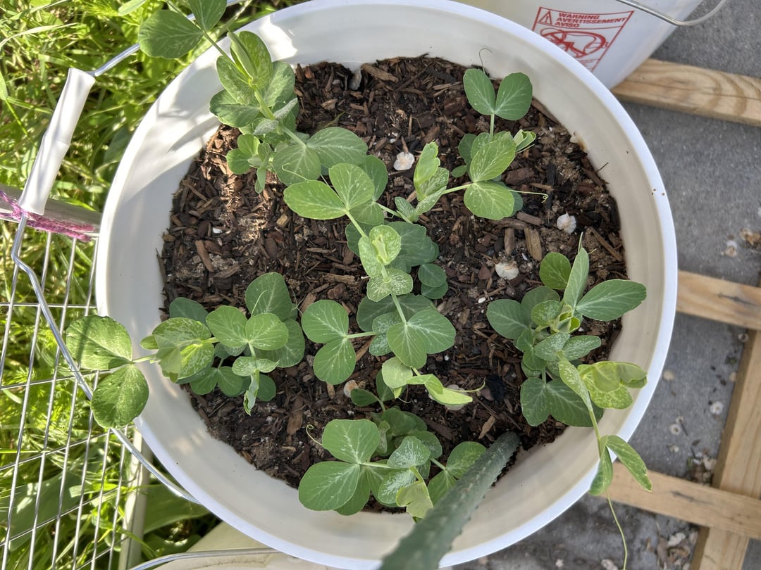 In order of appearance and container size: pole beans (5 gal bucket), peas (5 gal bucket) chard (3.5 gal bucket), spinach (4 gal bucket), mizuna (4 gal bucket)