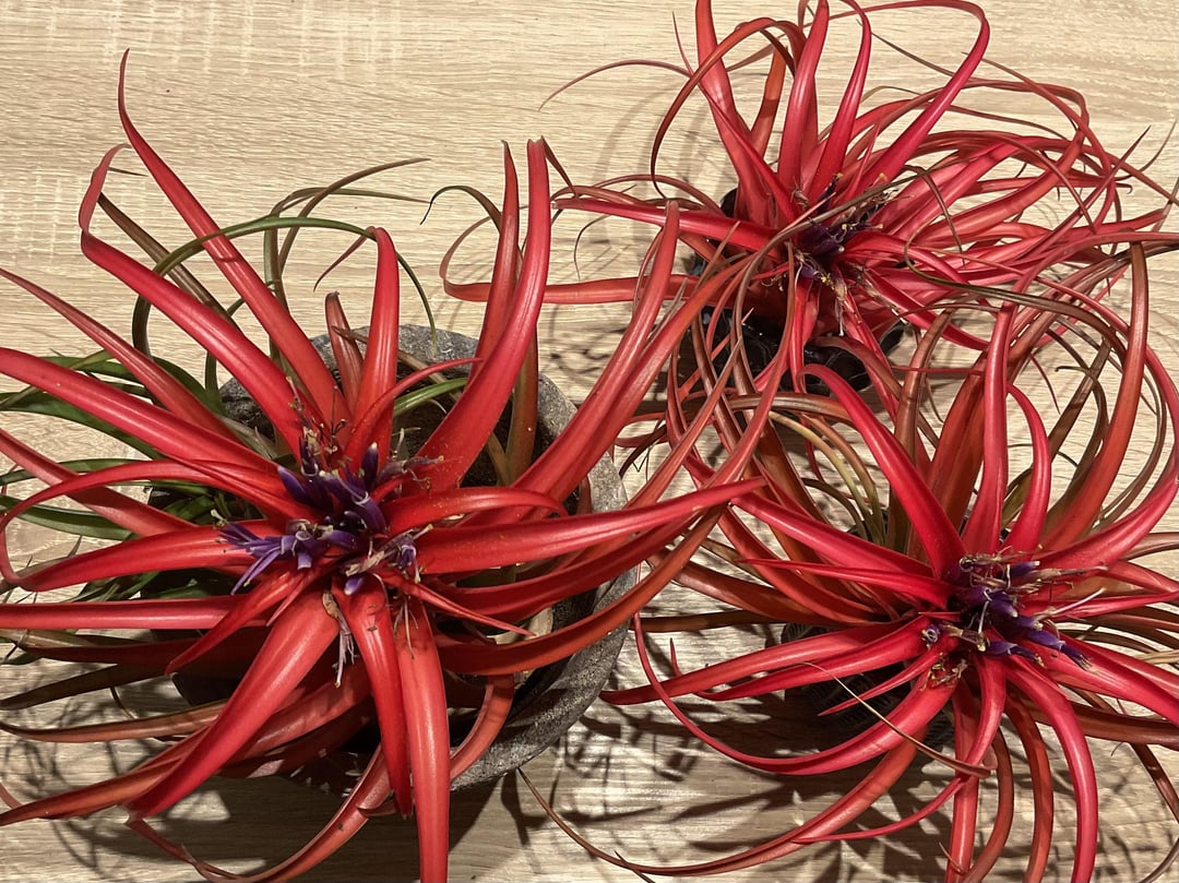 Hi! I have just bought these blooming capitatas and circinata, and my argentea and curly slim I already owned are blooming/making pups. The curly slim is quite interesting, as just like its mother plant, it is growing pups from the bloom spike itself, rather than at the base. Any help or tips for helping these plants would be greatly appreciated. My blooming coconut grove sadly got sunburned recently due to a mistake on my part (letting the plant dry in the full sun), so I want to make sure I give these ones much better care. I am keeping them shaded under an umbrella during outside time. I tend to stay away from soaking these days and prefer rinses or dunks, but I am open to better suggestions. Also want to know the sunlight requirements, as I am considering different places for them in the living room as well. Thanks in advance!