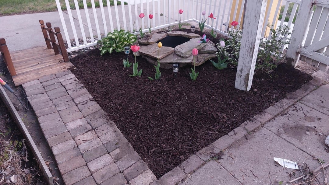 Photo of 1 small square of mulched area with tulips and a tiny pond with a small bridge and walk way. Another photo of a slightly larger rectangle of mulched area with several plants in the process of growing.