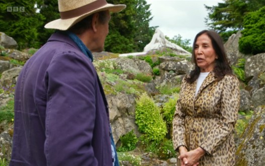 Monty visits the “heroic” rockery with Olivia Harrison (George’s widow) who lives at Friar Park. The rockery includes its very own Matterhorn and features 23,000 tons of Yorkshire stone which was originally transported to the railway station and then by road by horse and cart. Dom asked Olivia what George’s reaction was to the overgrown rockery, she replied “I think he was pretty horrified, but not intimidated. He just decided, ‘How are we going to clear it?’ They just got a couple of goats (Phil and Ronnie) and put them up on the top. He said they kept falling off, that was a problem, so they had to get rid of them. The brambles were impenetrable. He had a machete and a flame thrower. I am so happy he had the passion to clear this and get it started. He did the graft and we have him to thank for the resurrection of this rockery.”