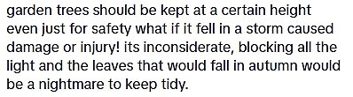 A third added, ‘Garden trees should be kept at a certain height even just for safety. What if it fell in a storm caused damage or injury? It’s inconsiderate, blocking all the light and the leaves that would fall in autumn would be a nightmare to keep tidy.’