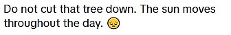 A second agreed, adding, ‘Do not cut that tree down. The sun moves throughout the day.’