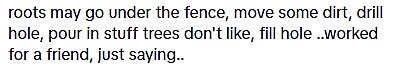 One wrote, ‘Roots may go under the fence, move some dirt, drill hole, pour in stuff trees don’t like, fill hole…worked for a friend, just saying.’
