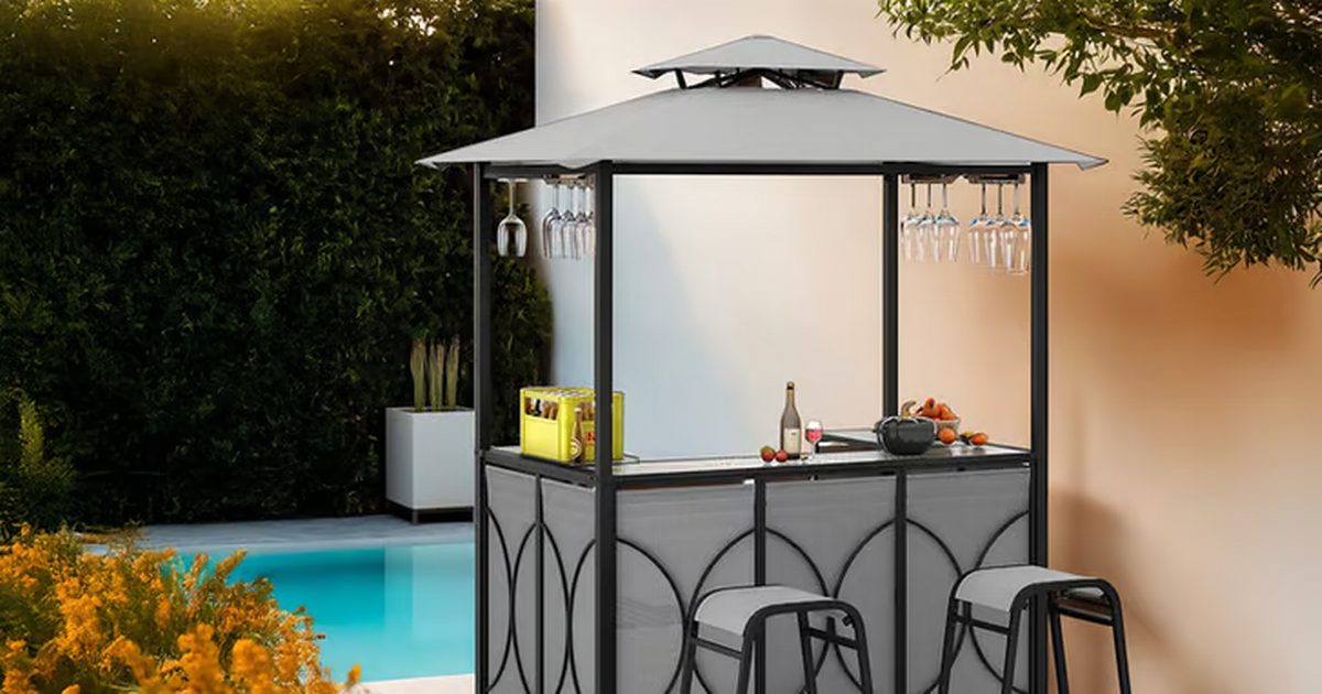 The product description reads: “Transform your outdoor space into the ultimate entertainment zone with this sleek grill gazebo bar set. With a stylish canopy, a tempered glass bar table, and two ergonomic bar stools, it’s perfect for BBQs, cocktail nights, and relaxed alfresco dining.