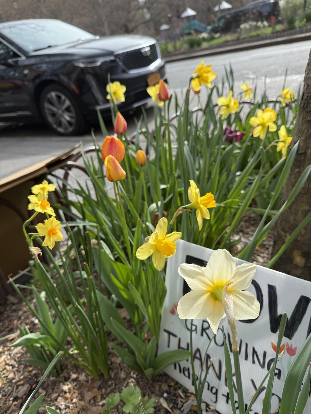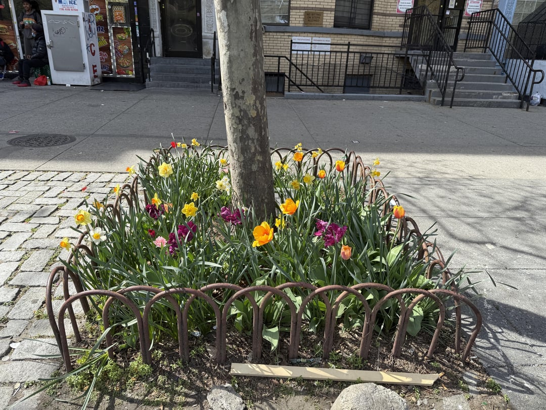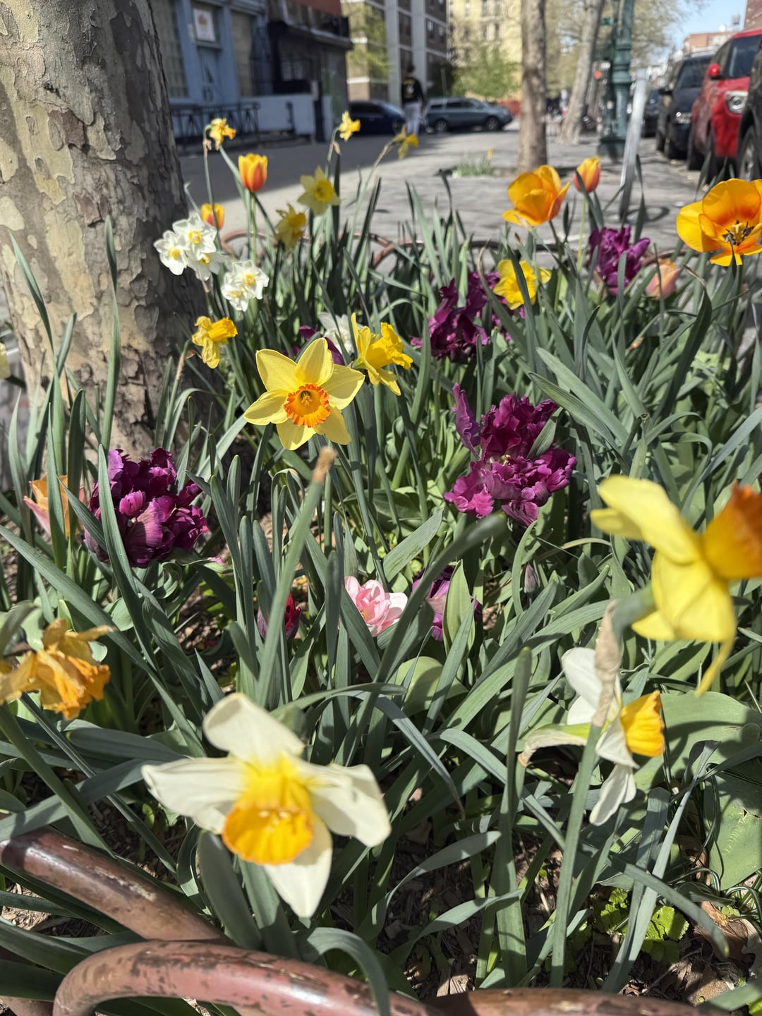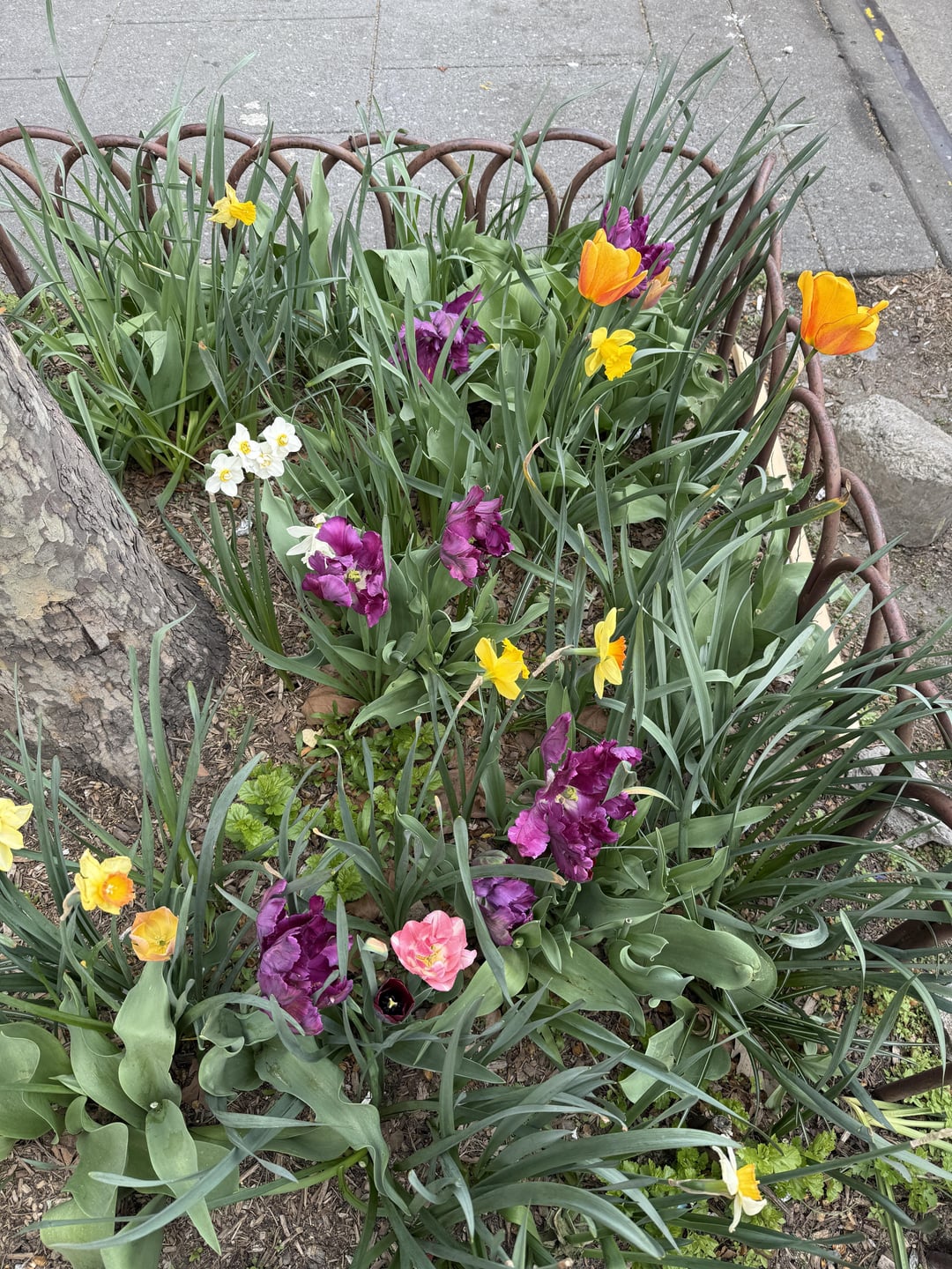 This year I filled in some bare spots and added more varieties of tulips. Did my annual mulching in the fall and fertilizing in the spring. I added a dozen ranunculus and irises to see what would happen. The early spring daffodils and tulips were a whole show! The iris and ranunculus came in sparsely but right when the tulips died off, I have hope I can keep adding to them to fill the garden out into late spring. I spread a quarter pound of wildflower seeds across both beds as well, though that is more interesting to the birds so not sure how much will come to flower. From March through May the 2 tree bed gardens have been a source of joy for the whole block.