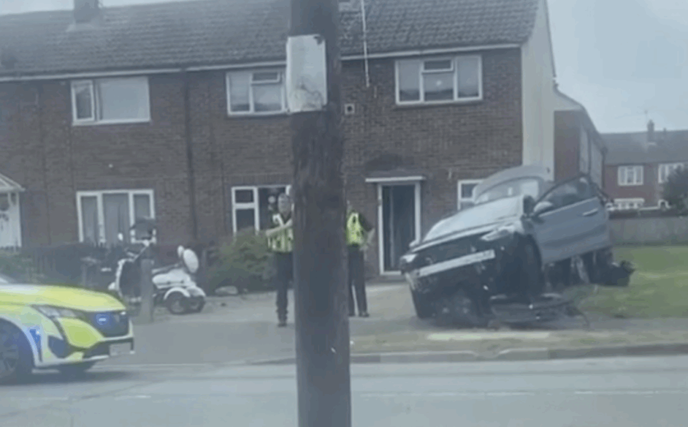 A car mounted a garden fence during a ‘dramatic’ crash in Swindon today (Thursday).