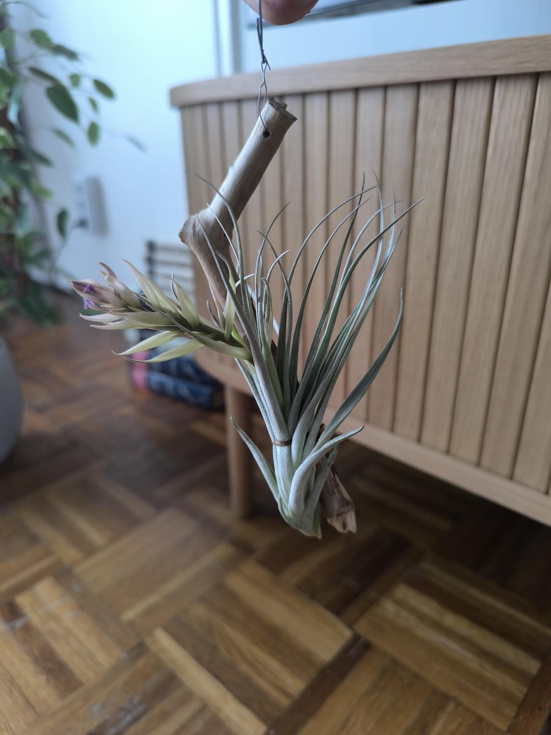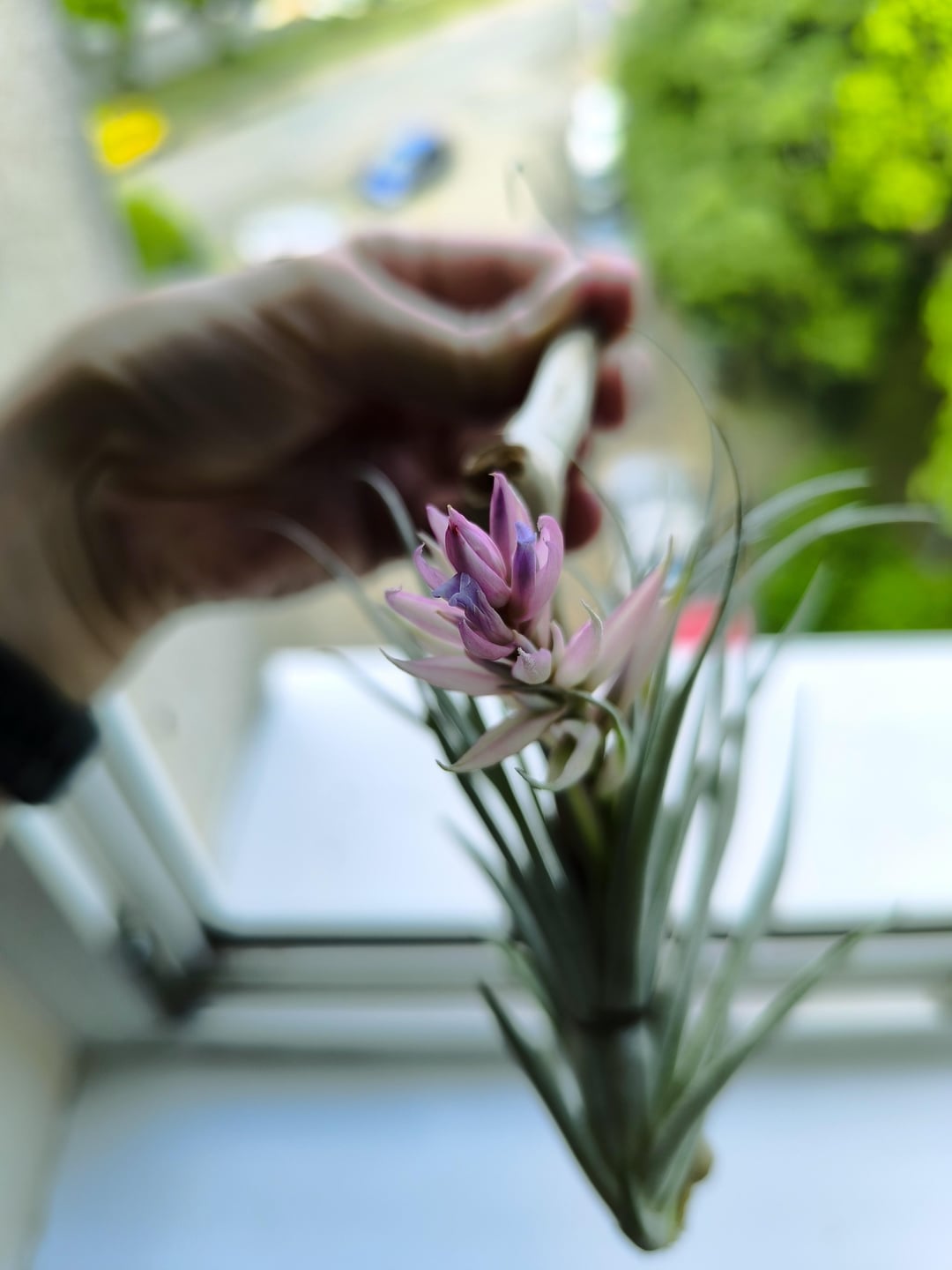 Hey guys! This is my first airplant, and I'm so excited about it. It started to bloom, so I assumed it feels great. However it started to lose its beautiful colour. It's an indoor plant, in a semi-well-lit place. I try to get it outside as much as possible, especially if its raining. I think it grew a bit in a month, and also started to lean. What do you recommend?