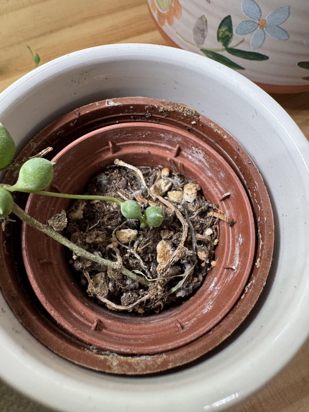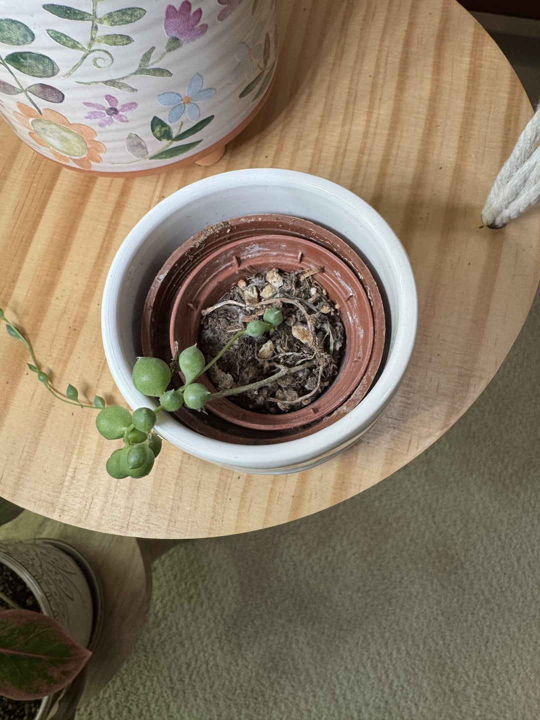 I also want to chop the long string so what’s in the pot is fuller, but I read that I need to let the soil dry a bit before doing that, so I thought I’d repot first and do that part later, but again, please tell me if that’s a bad idea!