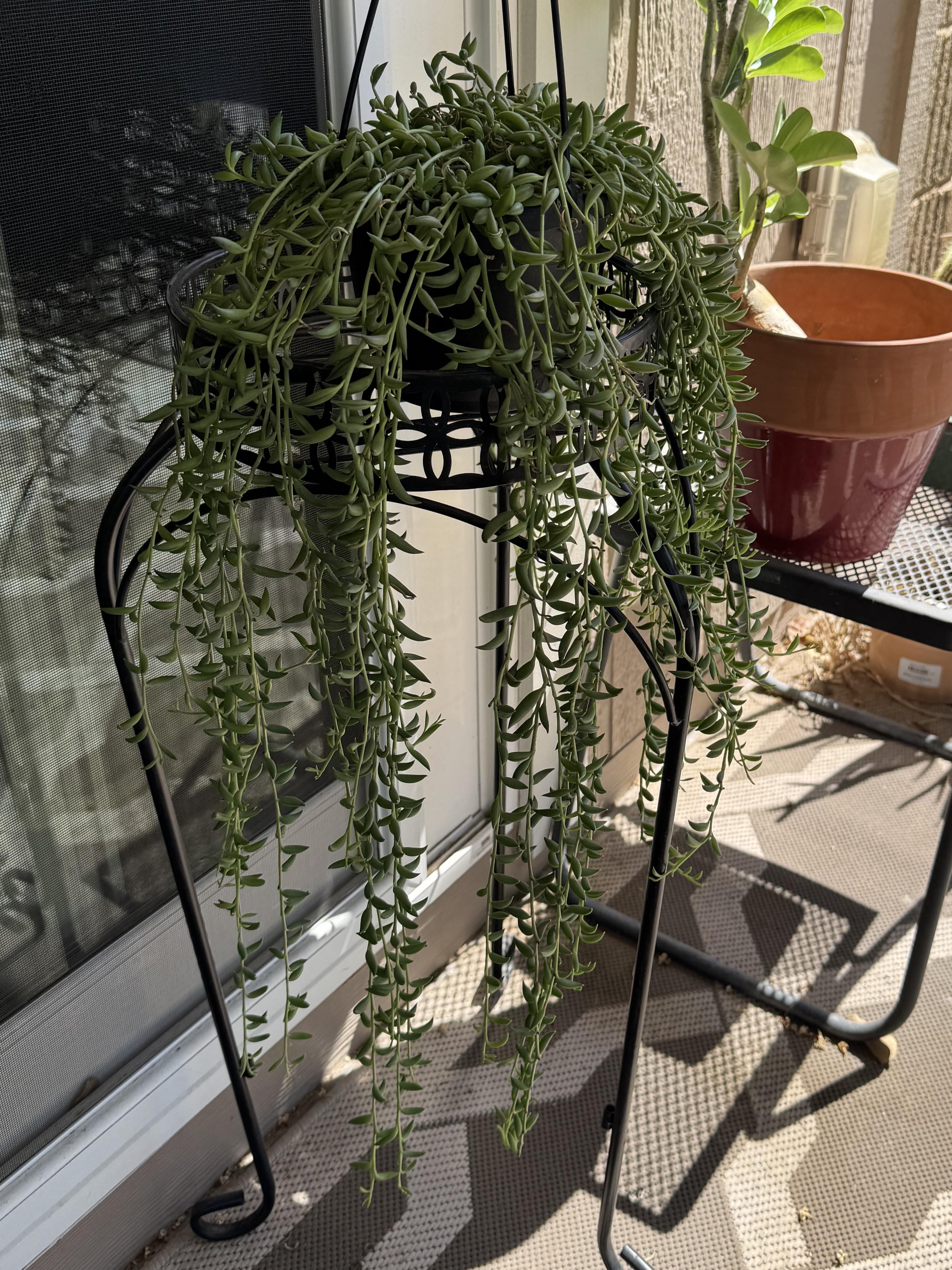 Hiya! Hoping there are some folks here that can advise me. Phoenix is such a difficult place when it comes to plants. 🫤. This is my baby String of Dolphins that has been on my patio for about 6 months or so. It gets a few hours of morning sun and is so so happy. However, 100 degree days are now here and getting hotter. I’m worried to the have her outside, but have no idea how to successfully bring her in for the summer. I do have two east facing windows, but the sun really shines in them and it gets pretty intense for a few hours through those windows. It that still my best bet? I don’t think my south facing sliding door will give her any or enough direct sunlight. Thanks in advance for your suggestions!! 🌱