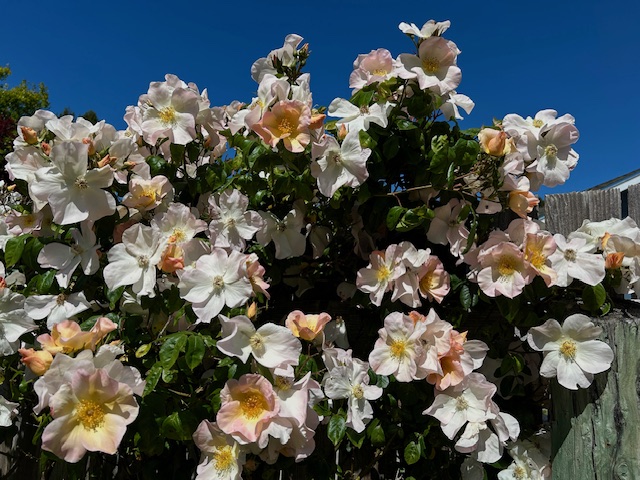 Whether you consider it to be a climber or a huge shrub, Sally Holmes is a rose that is hard to beat when it comes to showstopping beauty. I have a couple of Sallys covering a long, boring fence. They easily top the 6-foot fence with an abundance of roses. Flowers are produced in large clusters, almost rhododendron-like. Each flower is single and creamy white. Buds are a delightful apricot pink.