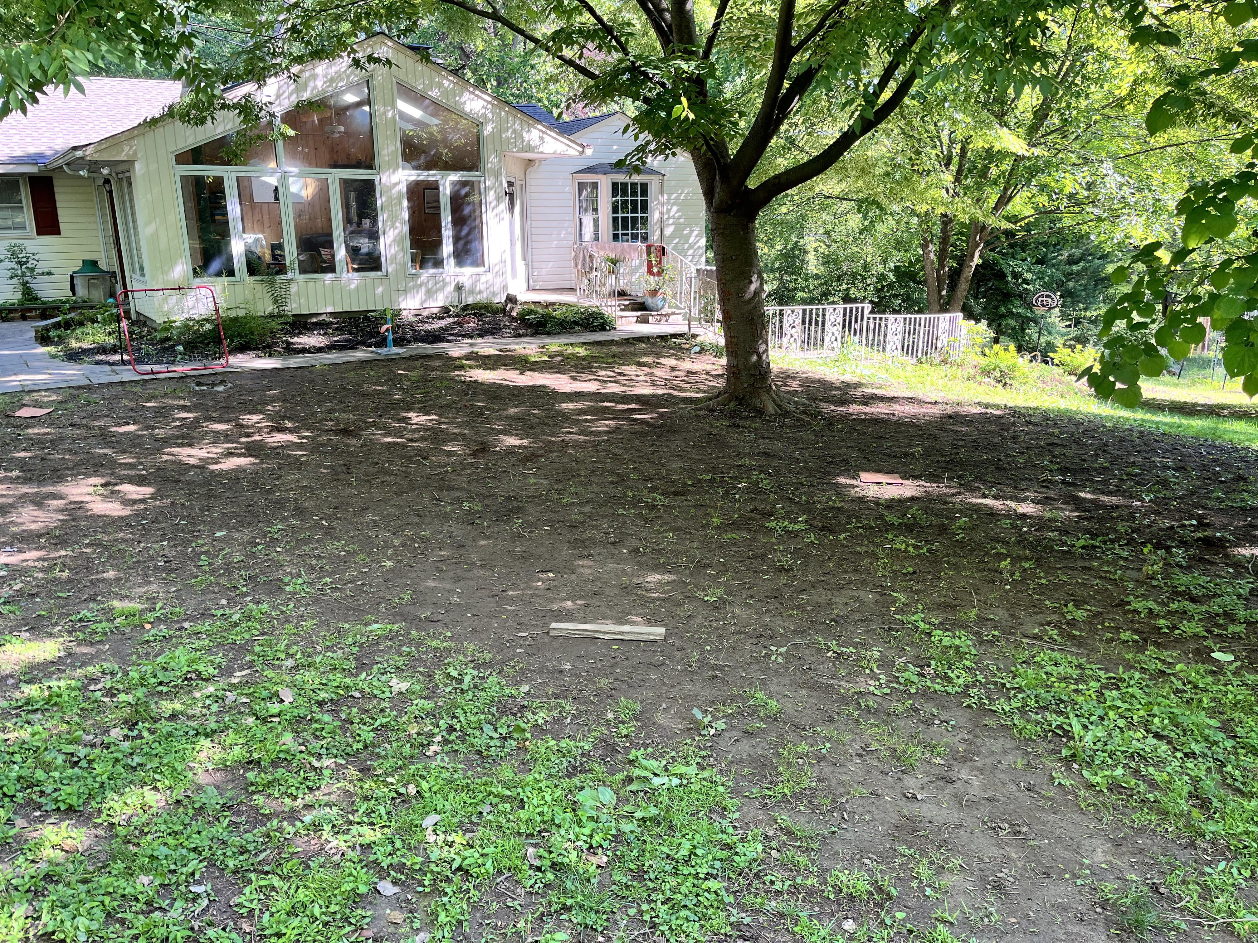 If the dirt is super compacted, throw down some cover crop, put gardening fabric over it, then cut it when it’s knee high in a month or two. Then sow whatever grass/clover mix and let your kids enjoy the space (and you enjoy not having to hose off the mud when they play outside).
