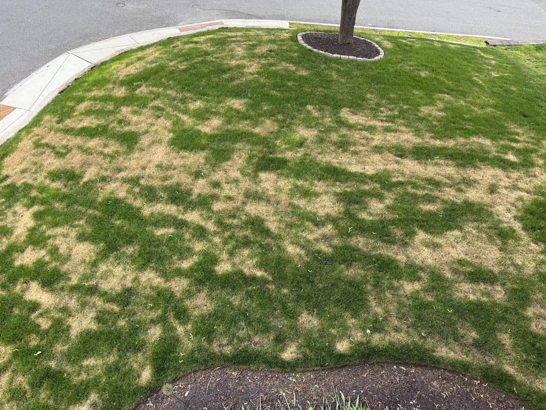 First, too early for grub ex, it was just wasted, in N US/Canuckystan – late June for that. Second, someone didnt apply the fertilizer per label and burned the shit out of their grass.
