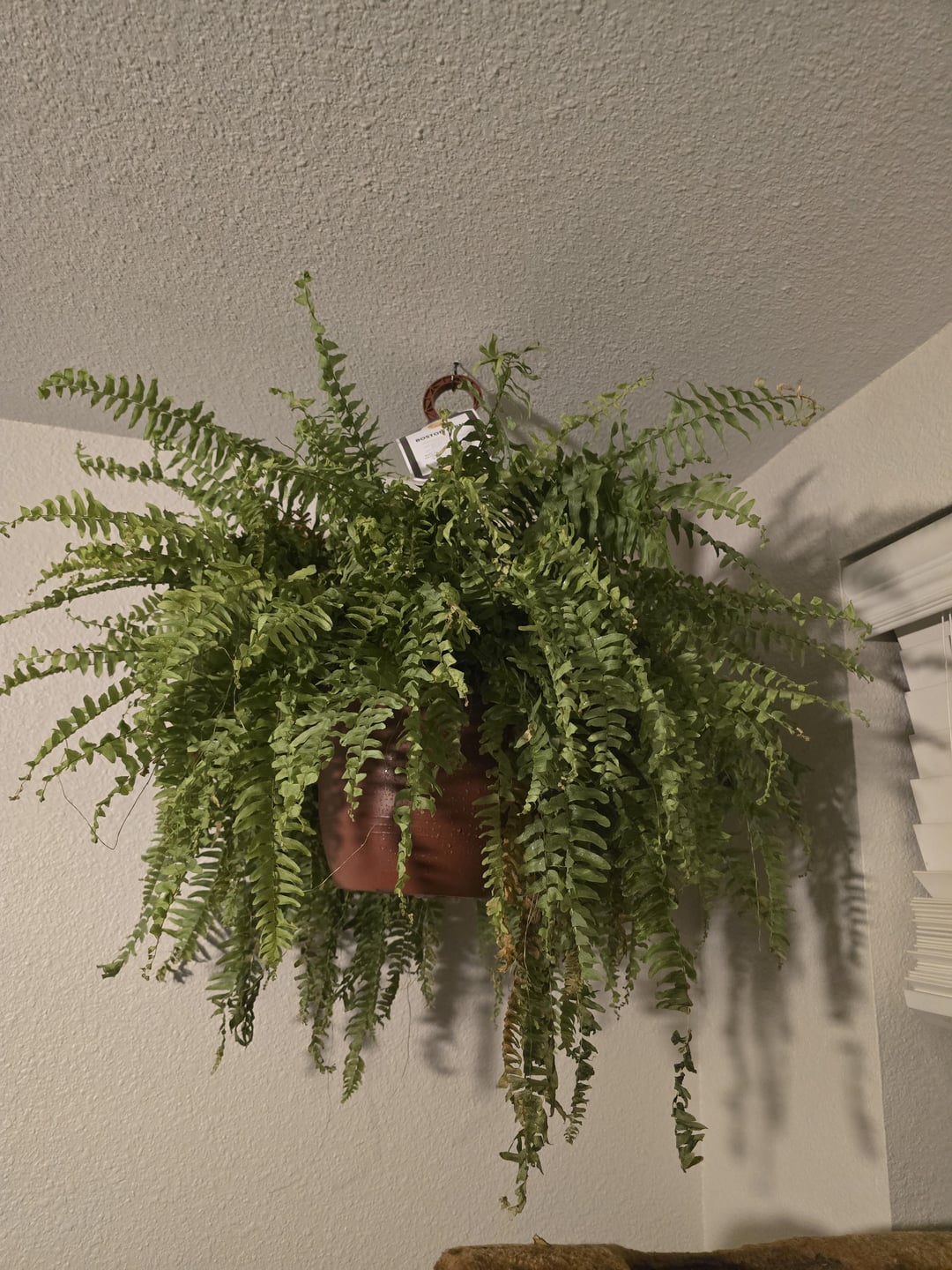For the fern (hanging plant) I’ll tell you what I do with mine because its been thriving for months now. But once a week (on the weekend) ill fill a bucket with water and just dunk the pot in it for 5 minutes so that the dirt absorbs what it needs. If you dont have a bucket you can just put the plant in the sink and run water through it until you see water draining out of the bottom (assuming the pot its in has drainage holes) and then through out the rest of the week, every other day I will pour about a cup of water but that’s because mine drys out quickly. Use a moisture meter. They help tremendously. Dont worry if when you move it a lot of its dry leaves fall out, there very delicate and its normal. Give it a good shake to clear all the dead leaves out or just trim them off.