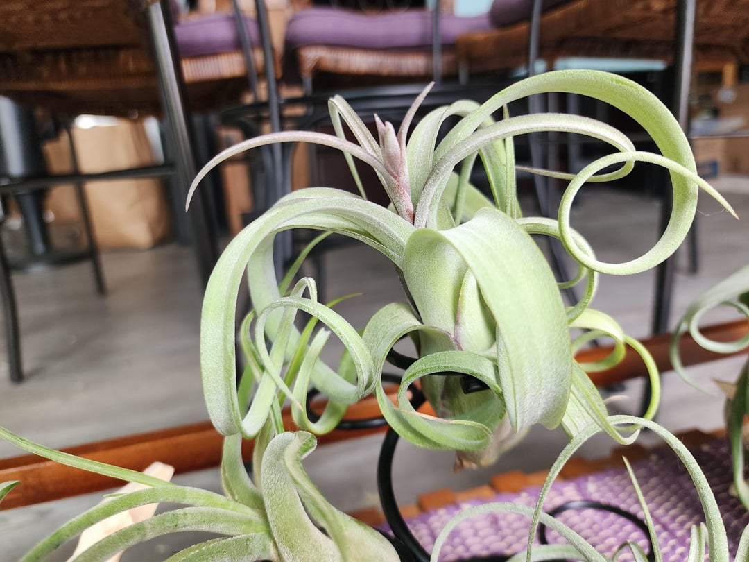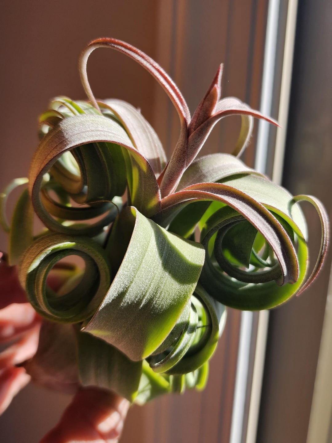 My Curly Slim was thriving, blushing, spiking and suddenly stopped. Her leaves are turning back to green (??). She's perfectly healthy, well hydrated, gets bright, indirect light and plenty of fresh air.