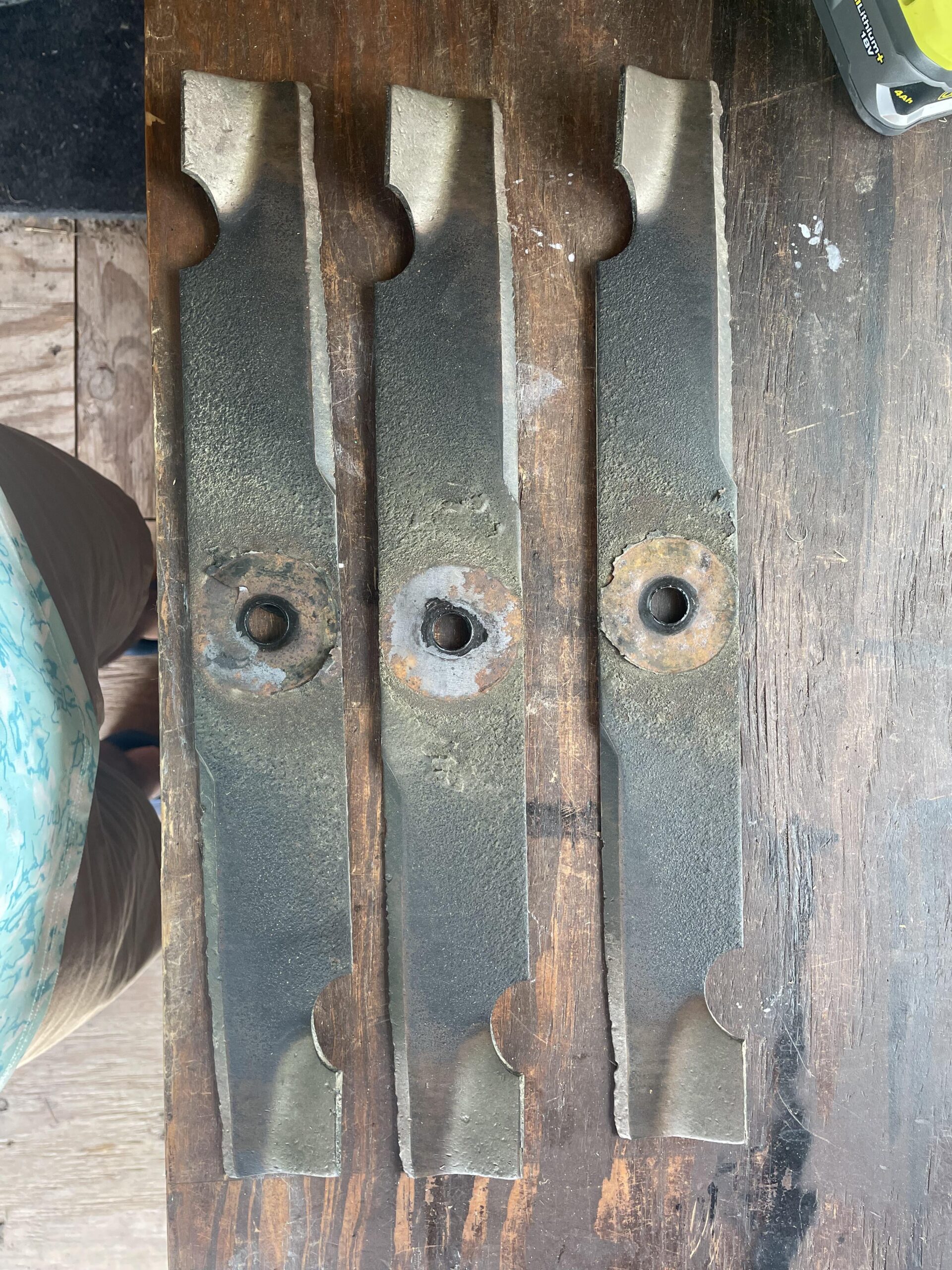 I put a grinding blade on my angle grinder, it takes maybe ninety seconds to sharpen the mower blade. It’s not going to get it kitchen-knife sharp and it’s a little more wear on the blade than a professional job would be, but it’s worth it for how easy and fast it is.