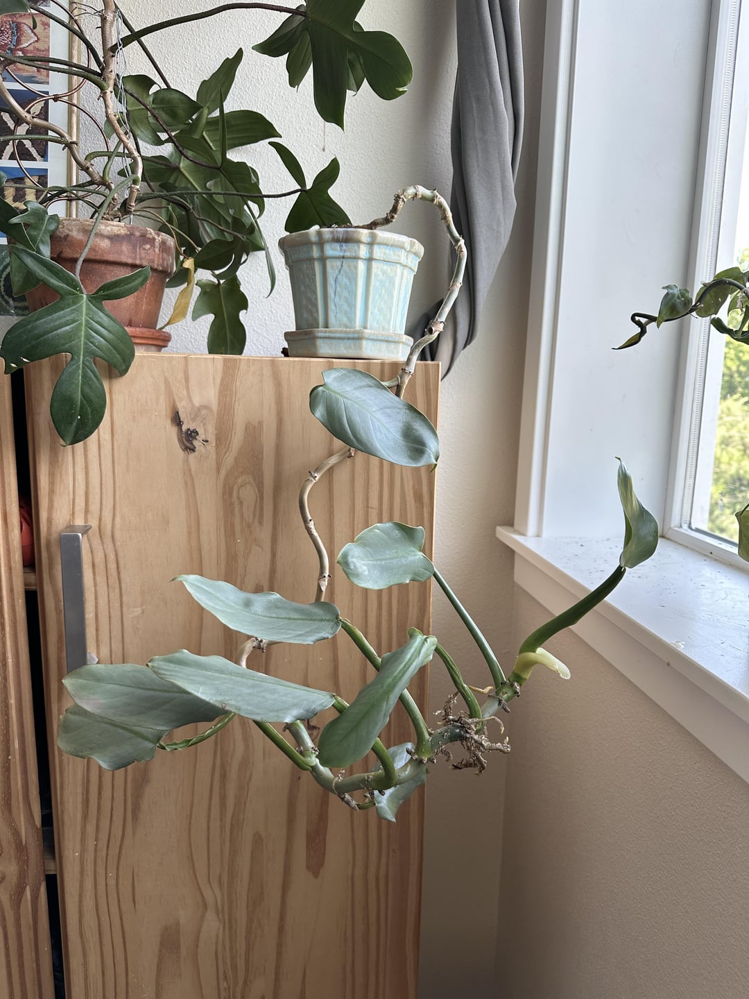 I got this silver sword as one of my first plants, before I knew about supports or climbers vs. trailers. It recently matured to putting out leaves via cataphyll vs previous petioles, so I air layered it and am gonna take a top cutting, but the scrungly mother plant will stay living its scrungliest best. It remains an experiment and sentimental homage to beginner-ness ❤️