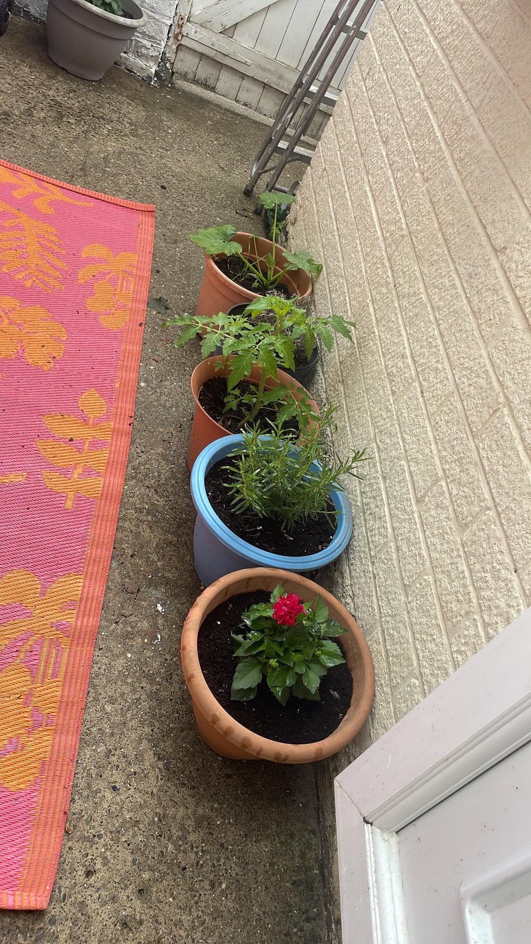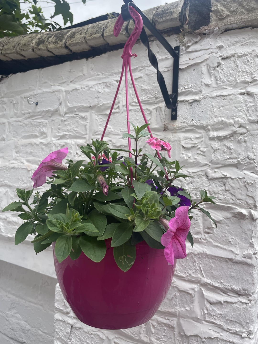 I tried to plant lavender in a window box but it failed so I rescued the plants, put them in pots and added some petunias to the window box. I planted up the conical hanging basket with what I think are trailing petunias and lobelia, I can’t take credit for the pink plastic one as that was a gift. In pots I’ve got dahlias, tomatoes, courgettes, lavender and rosemary.