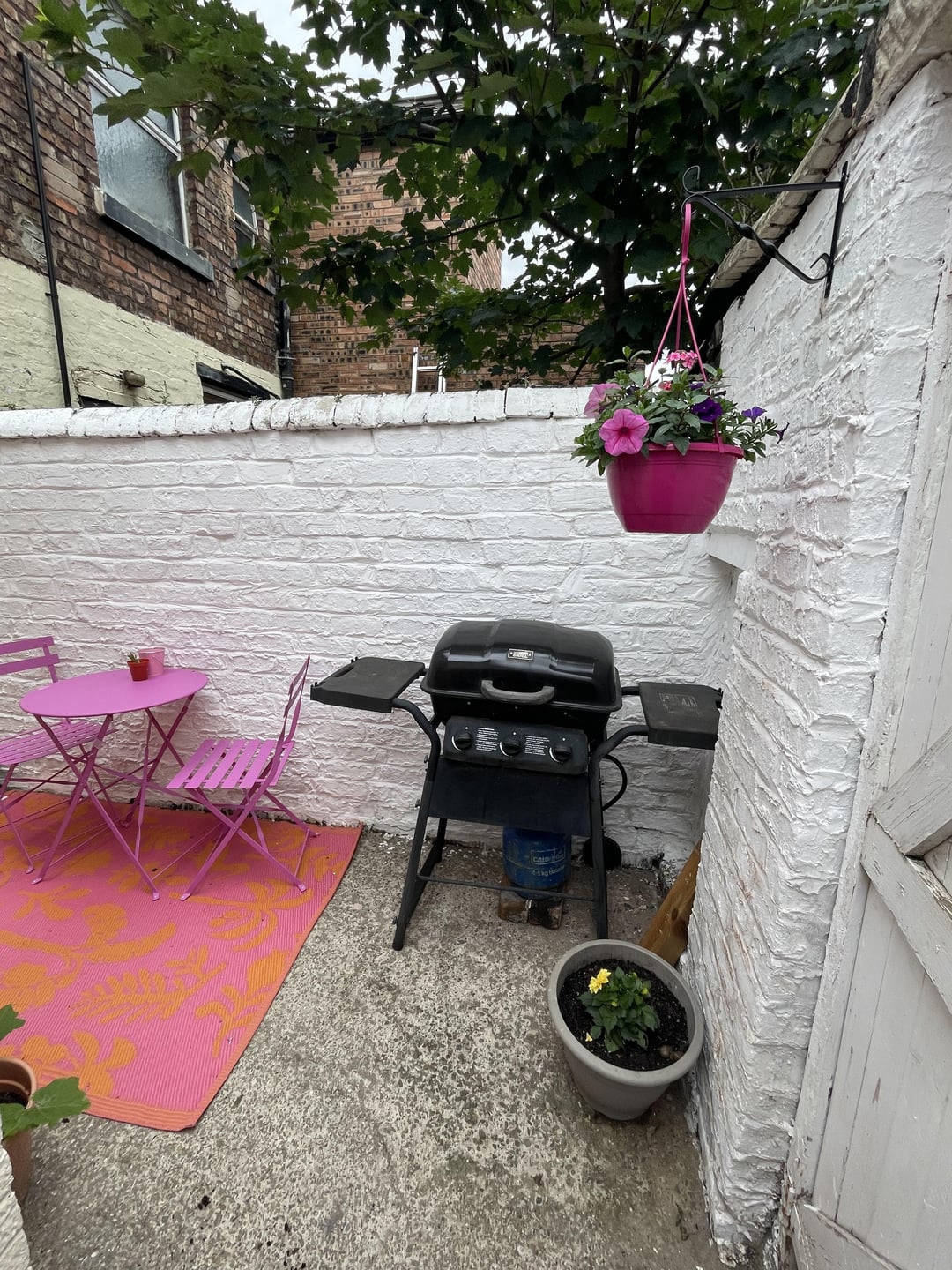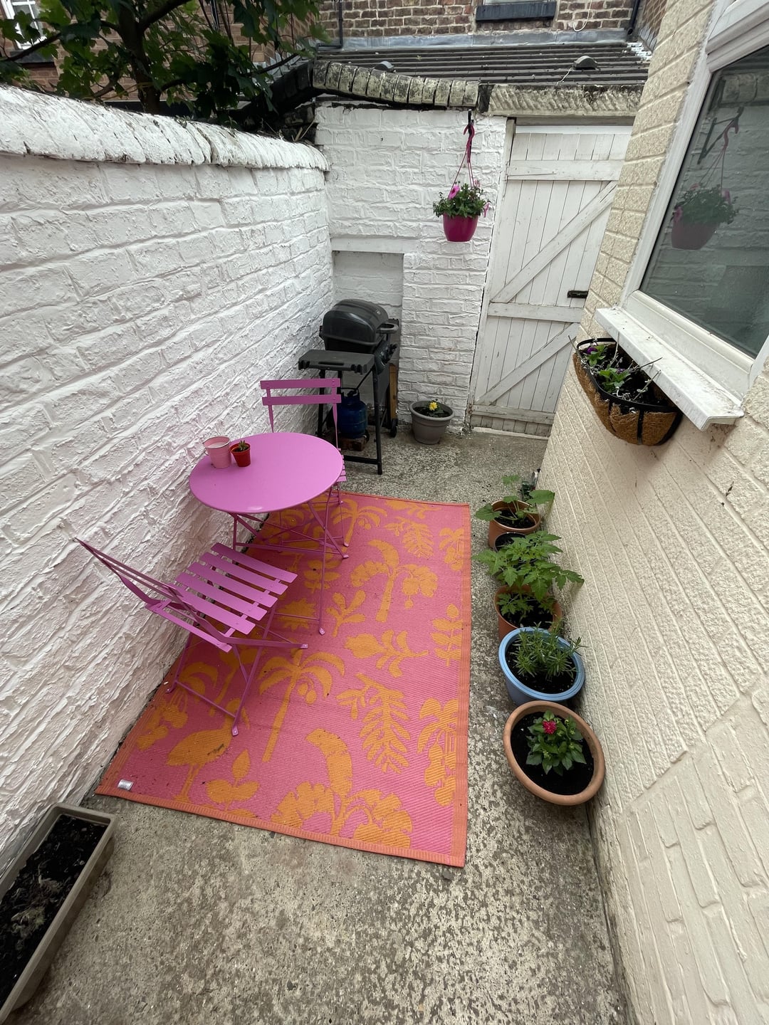 I can’t legally do anything about the concrete floor as it’s listed, so I jet washed it and put an outdoor rug down to brighten it up a bit. I even managed to squeeze in a double retractable washing line and a mini BBQ area to make as much use of the space as possible! It’s south west facing so I like to have my lunch out there on sunny afternoons.