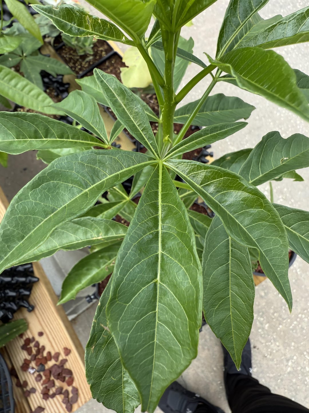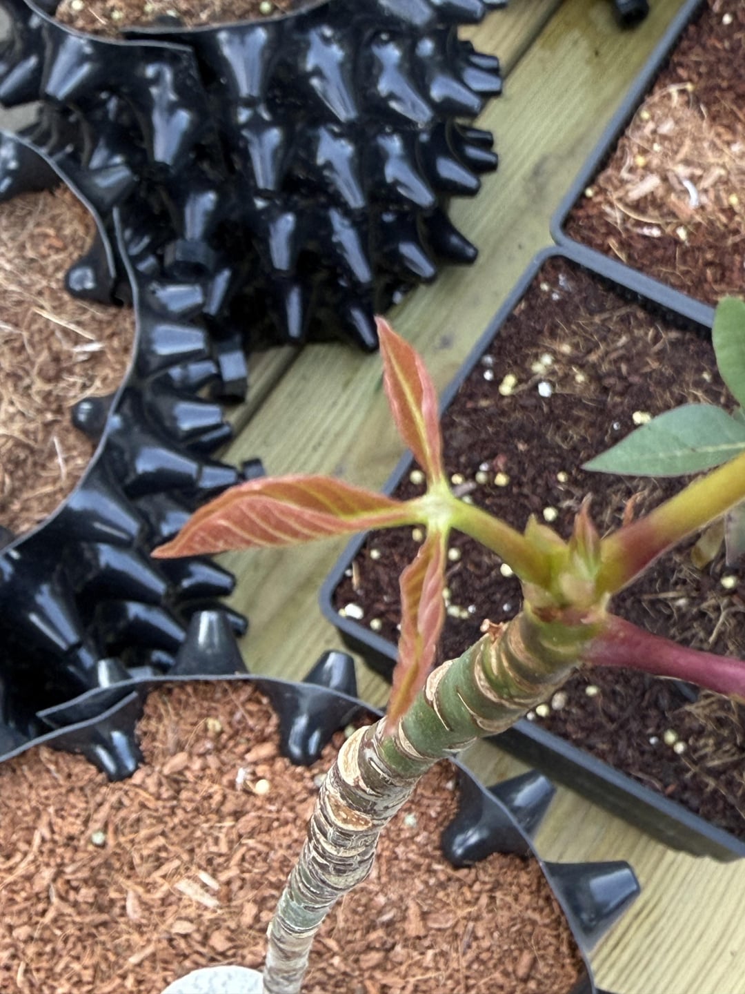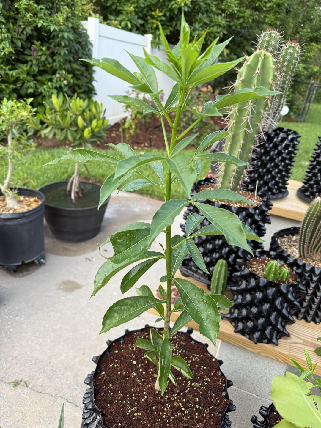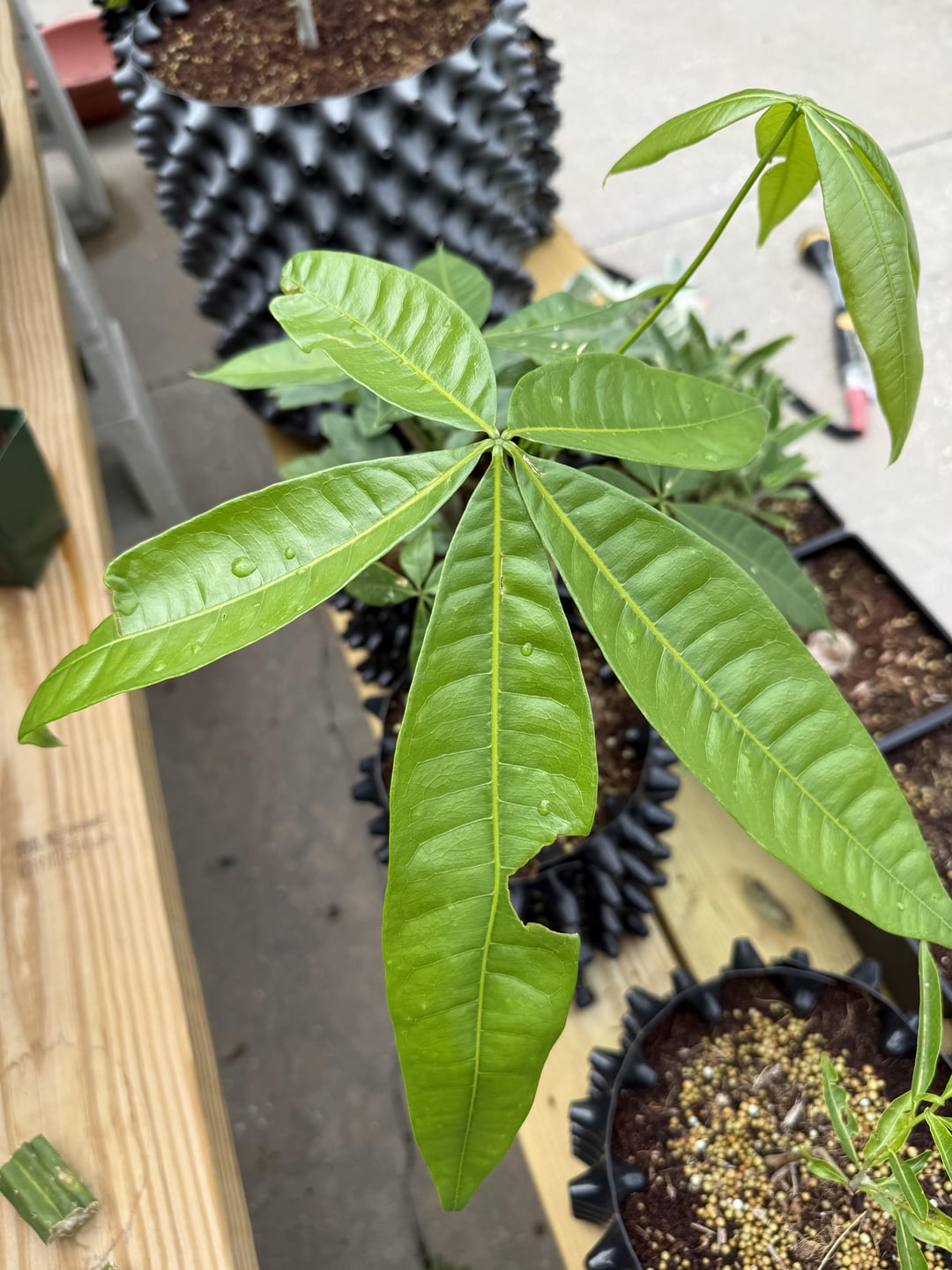They fell into a sort of half dormancy when I put them outside because I sowed them too early in the year; not dropping leaves, but completely halting growth. They woke up about a month ago and exploded with new growth, the plant in the first pic grew a foot in one month. Its leaves are also switching from simple to palmately compound, showing its resemblance to the other members of its subfamily I have growing alongside it (Pachira, Pseudobombax, Ceiba).