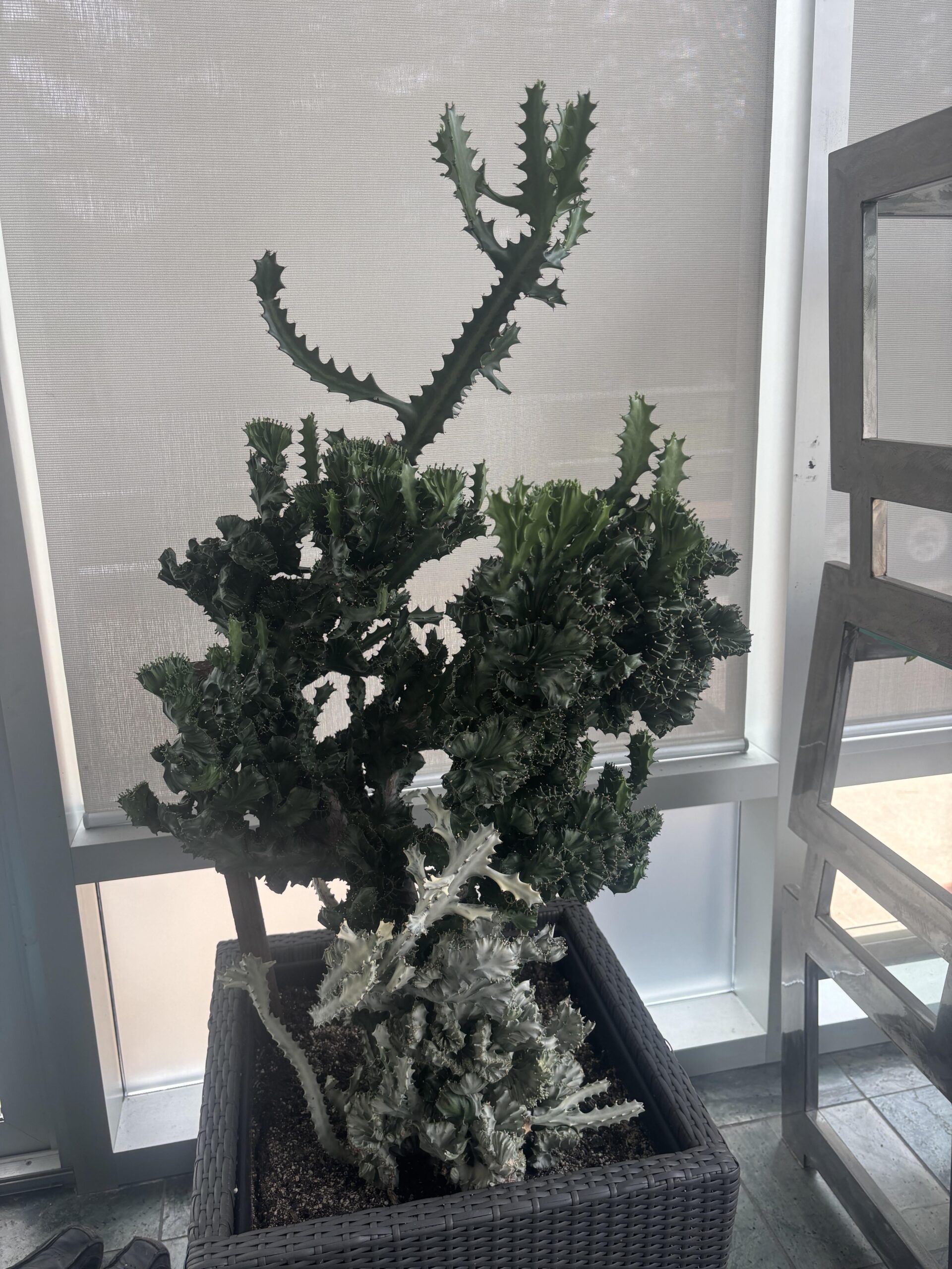 Looks like a crested Euphorbia lactea ‘White Ghost’ that reverted to a crested Euphorbia lactea that reverted to just a Euphorbia lactea. 😂