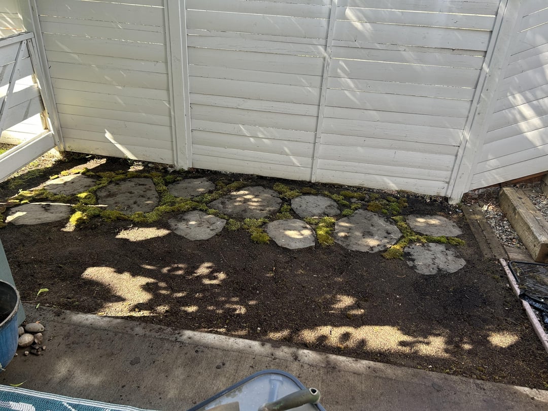 My 14×6 strip of “lawn”, it was 50/50 moss and dirt tbh, I even saved a bunch of the cushion moss to plant around the paving stones (those are new too). I think it looks funny with the patches of moss right now LOL. landscapers are going to be like wtf this crazy lady doing.