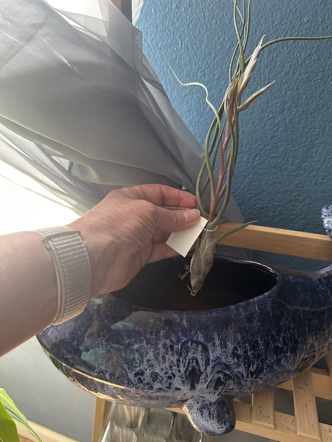 I bought this air plant to go in the whale planter because I cannot put a houseplant in the whale at this time. This is my first air plant. I’ve looked online and some sites say to soak it every couple of weeks and others say to only mist because soaking will kill it. Also, what can I fill the body of the whale with so the air plant is supported but not suffocated? I appreciate any information on keeping this pretty girl happy and healthy.