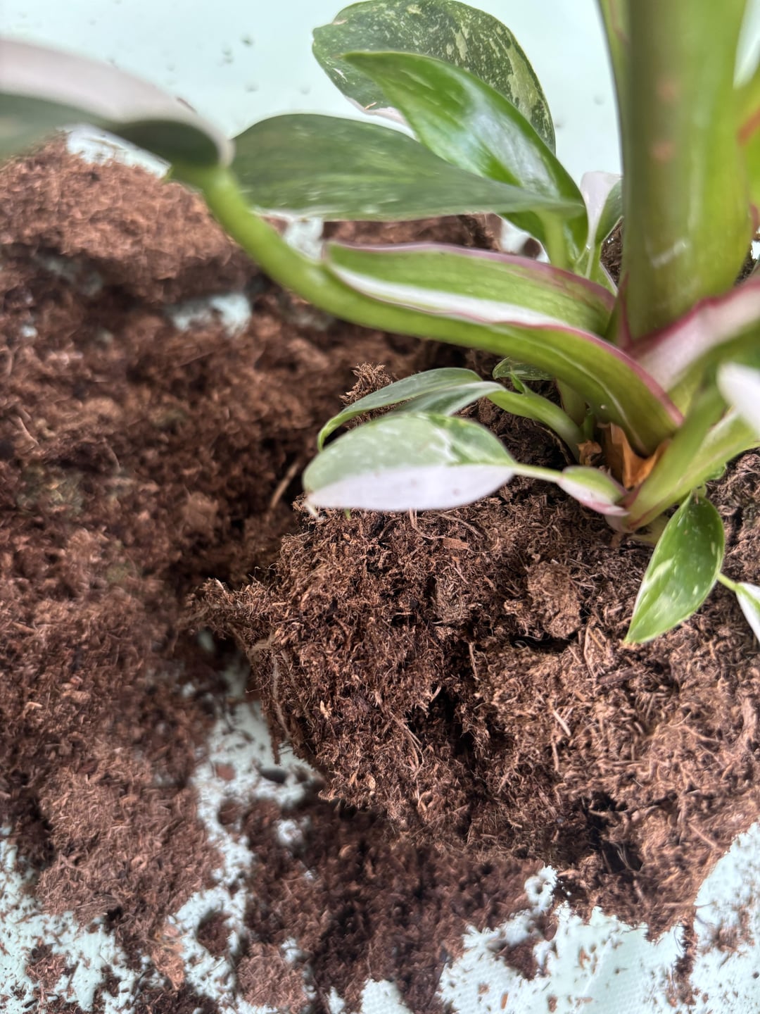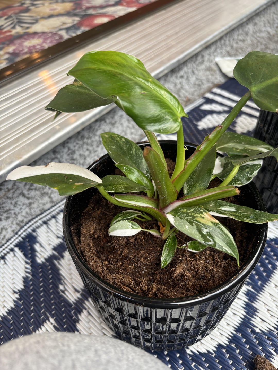 Found this very dried out baby at Walmart today and got really excited because look at that half moon genetics! She’s going to be a stunner! Tag said she’s a white princess. New pot and organic soil! Can’t wait to get her to moss pole status!