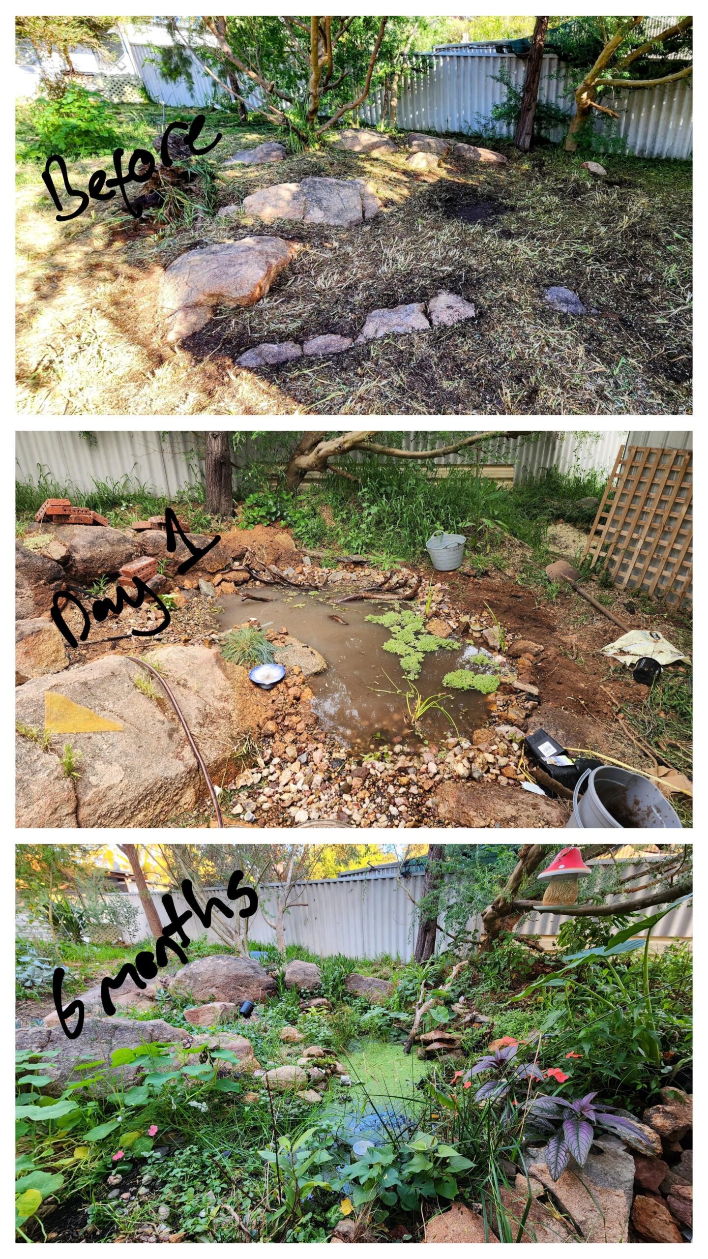 Weeds, grass and rocks to thriving wildlife pond! by WittyThingHere No Lawns 5 Comments WittyThingHere 4 months ago Located in the Wheatbelt region of Western Australia, zone 9 equivalent One_Cauliflower_3536 4 months ago I want to put one of these in Confident-Jicama-572 4 months ago fantastic traveling_confusion 4 months ago Looks fantastic, I love it! May I ask, what led you choose this location in your garden? bluefancypants 4 months ago I love it! It is so beautiful! Write A CommentYou must be logged in to post a comment.