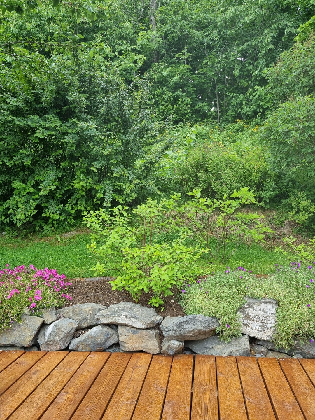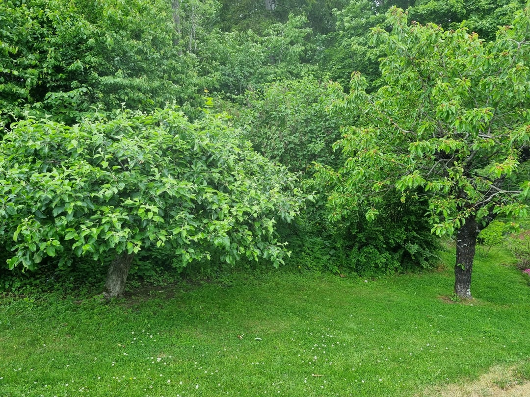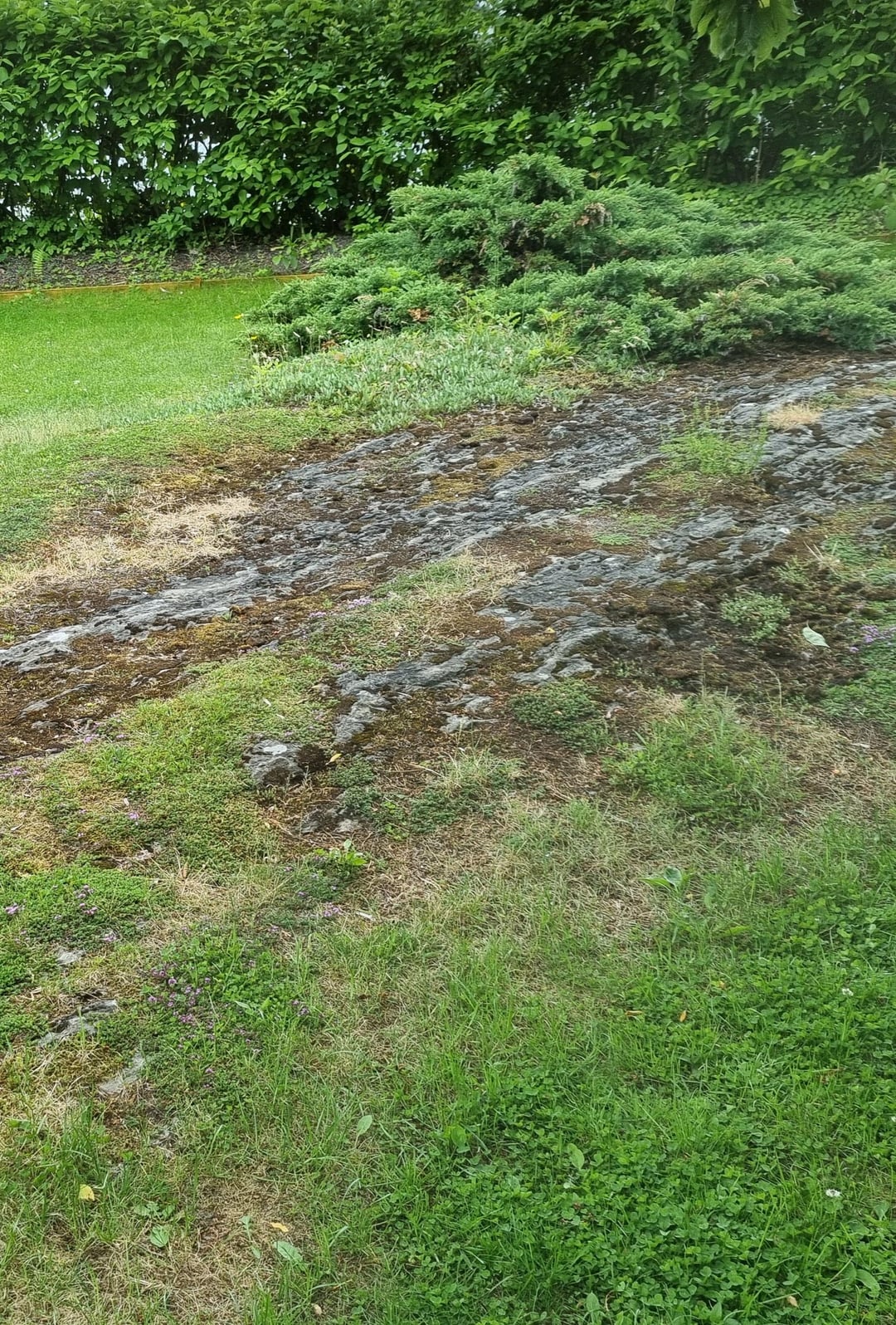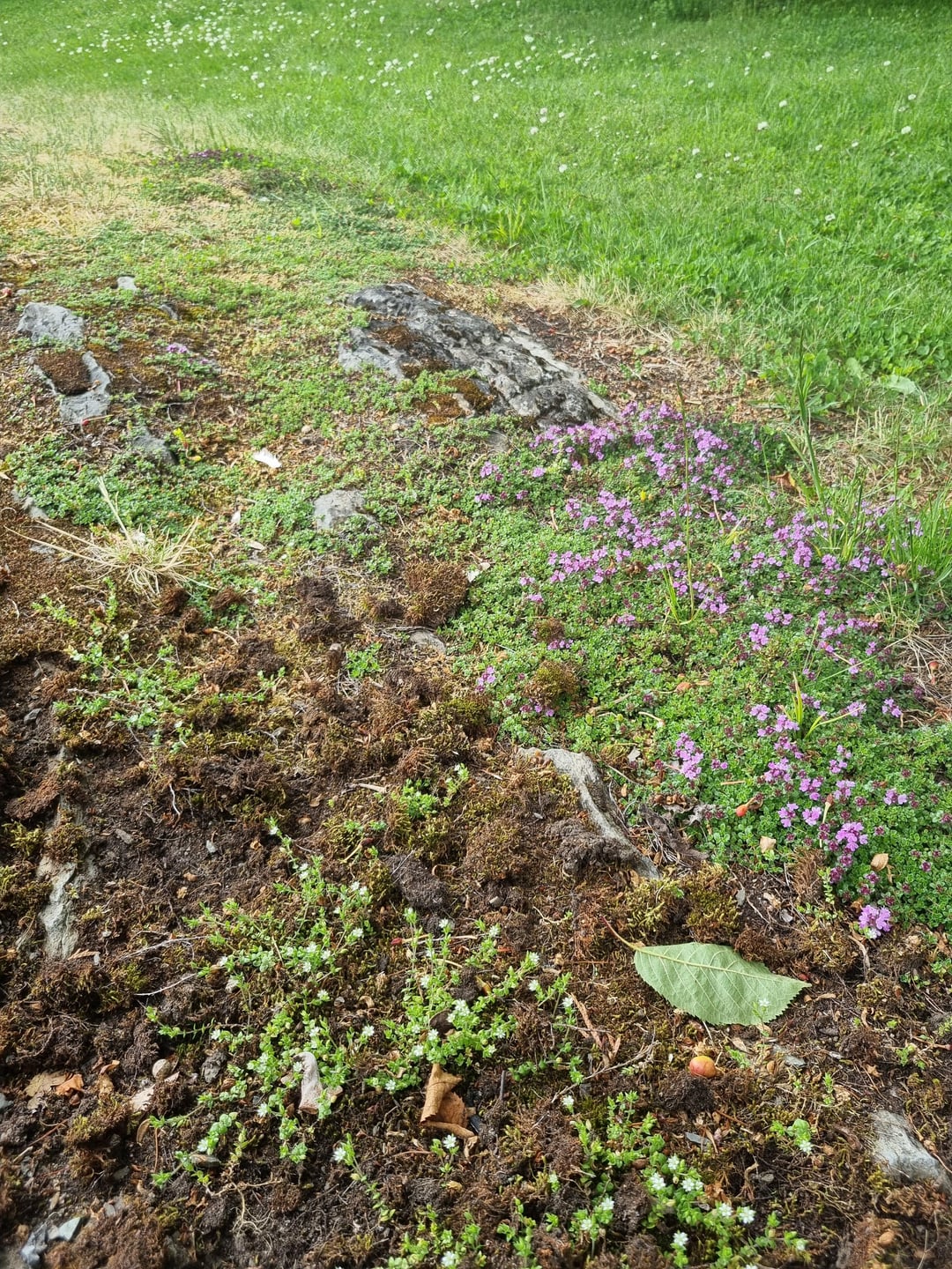 There's a rock sticking out in the middle, where cute flowers have been thriving for 20+ years. Above the rock is an area with shade from the hedge, it has moss and (soon) wild strawberries. To the right is an apple tree and a sour cherry tree. Behind them a mound and small forest.