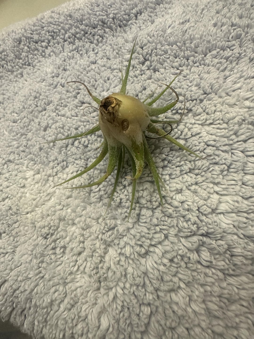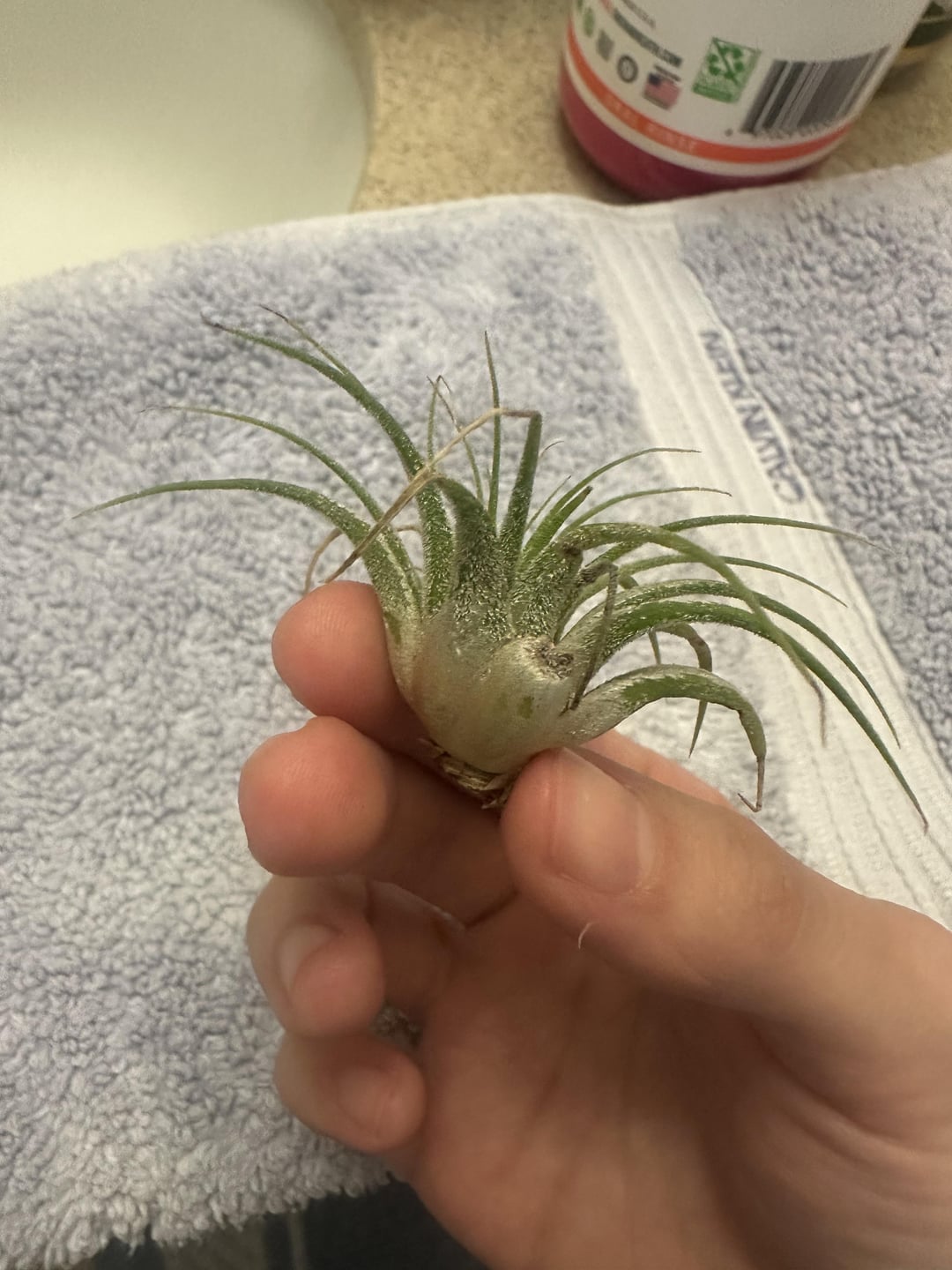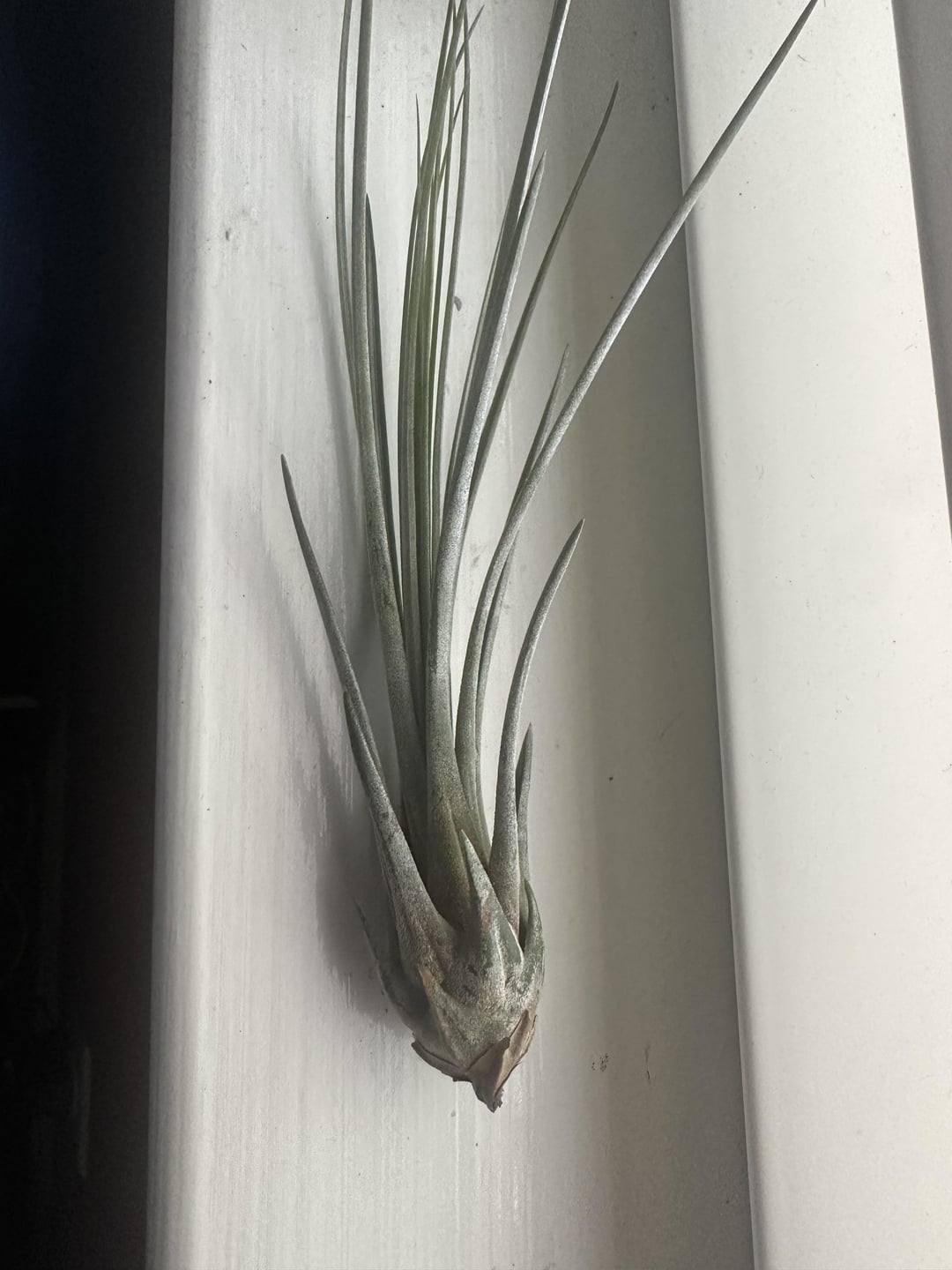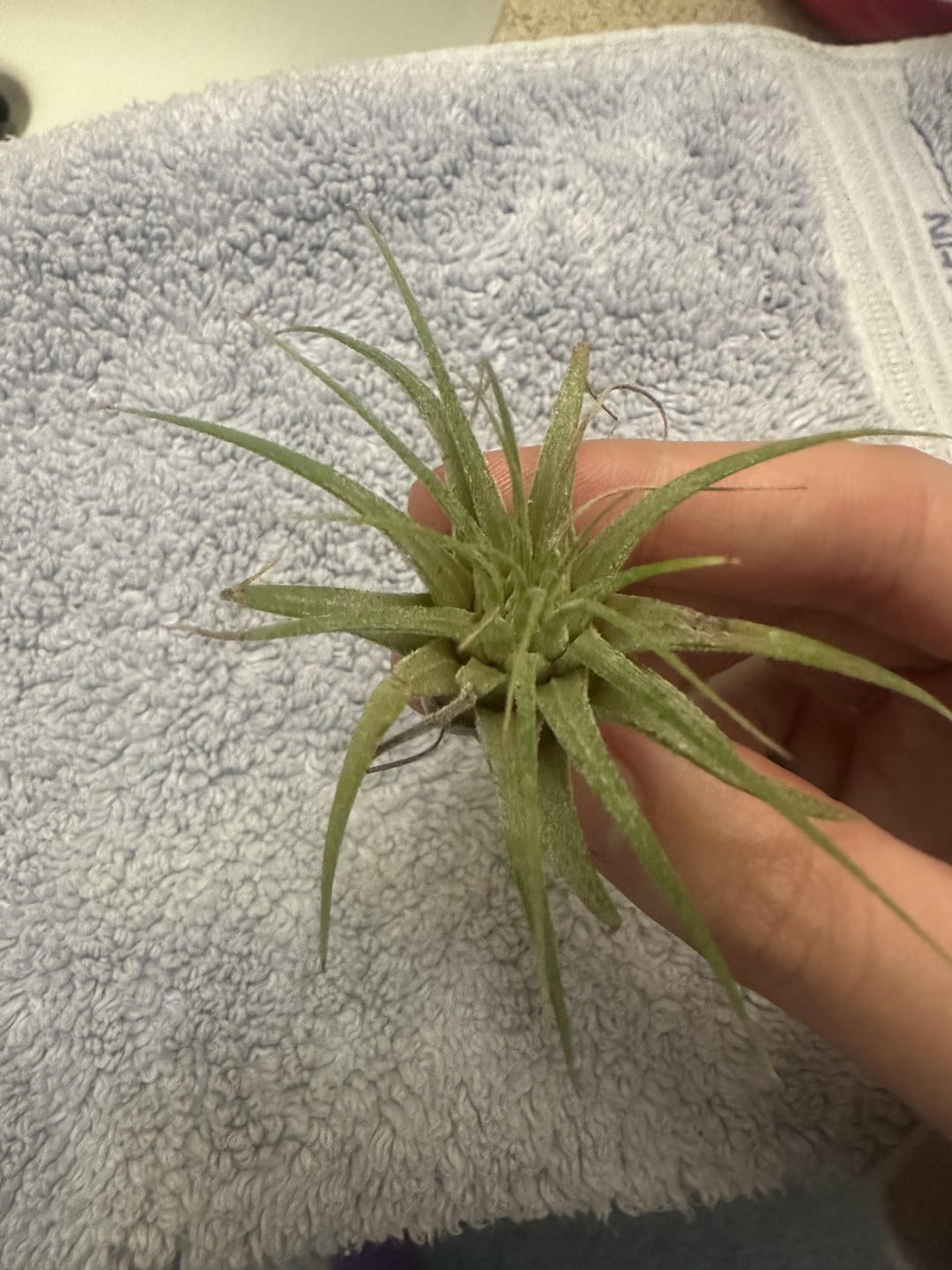 Hi everyone! I am new to air plants and i’m wondering if these both look okay. I’ve had them both for about a week and just want to make sure I’m not accidentally killing them. They are both placed on a west facing windowsill that is covered by trees, with a normal temperature around 78-80 degrees f and humidity around 45%-50%. They are soaked in the morning once a week for about 30 minutes and dried upside down for almost the whole day before I place them back into their spots. I’ve noticed that the smaller plant has brown leaves and a yellow-ish base along with some brown spots; the home I rescued the small one from didn’t really give it much sunlight and it was soaked overnight once every 3 weeks. Should I just wait and see how the smaller one adapts to my routine before I get worried? Is there anything I should change as far as care goes?Thanks for any insight! Also, would anyone happen to know what species these are? I think the small one is ionantha, but not too sure on the longer one. (The first 3 pictures are of the same plant.)