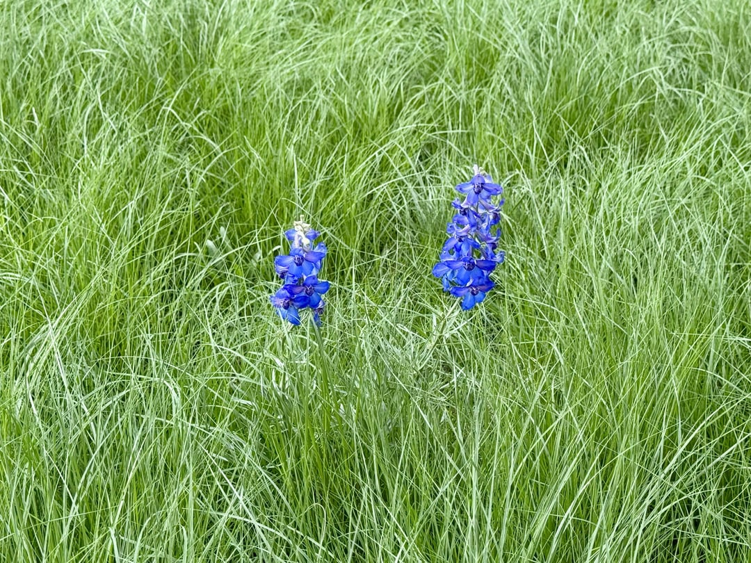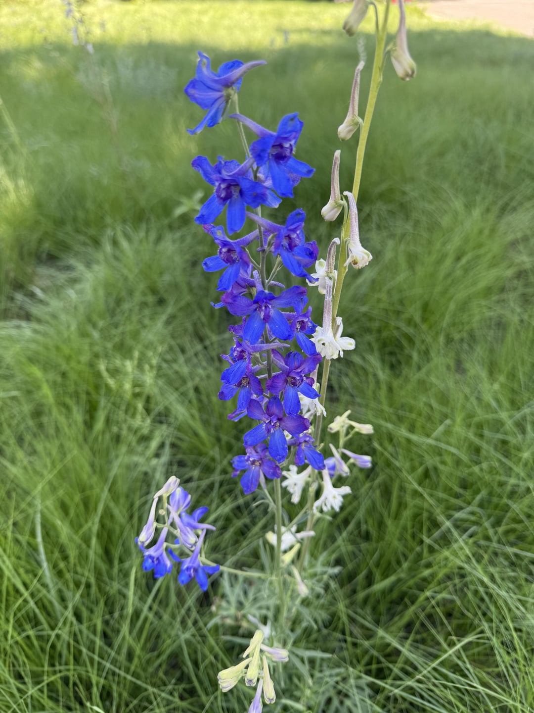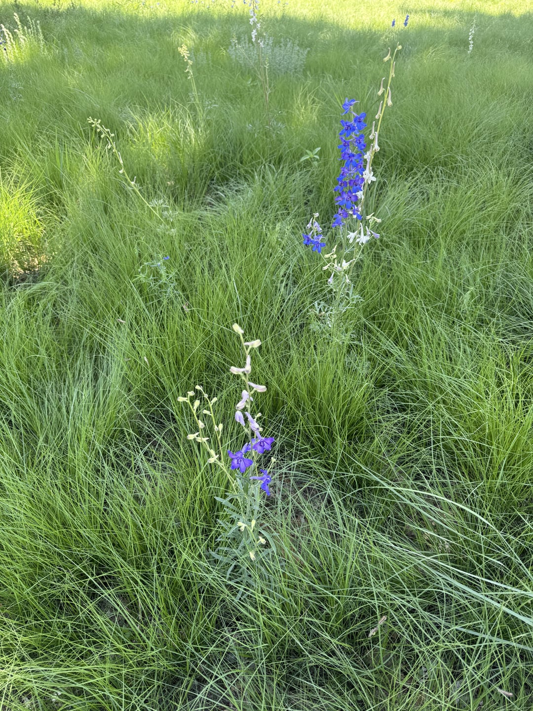This year we saw Astragalus bisulcatus (Two-grooved Milkvetch) and Delphinium geyeri (Geyer’s Larkspur) bloom. The bisulcatus has been growing for a few years (2-3?) but this was the first year with flowers. The larkspurs germinated and grew just this year. I sowed them both directly into the established Blue Grama meadow sometime between 2-5 years ago. We’re in Denver. We received over 5” of rain this month, double the average for May, which I suspect prompted the larkspurs? There are also a few white Prairie Larkspurs in there as well.