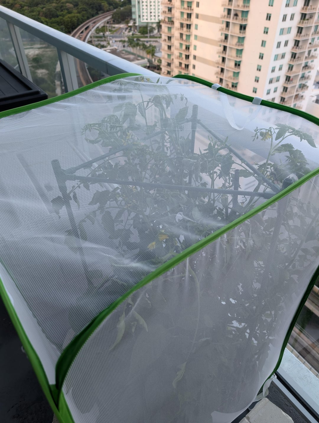 My tomatoes were over eight feet tall last year. Do you know what type of plant you have? Determinate vs Indeterminate? But besides that, idk what your wind is like in Miami, but once a plant is that size, they can generally tolerate wind if they’re staked up.