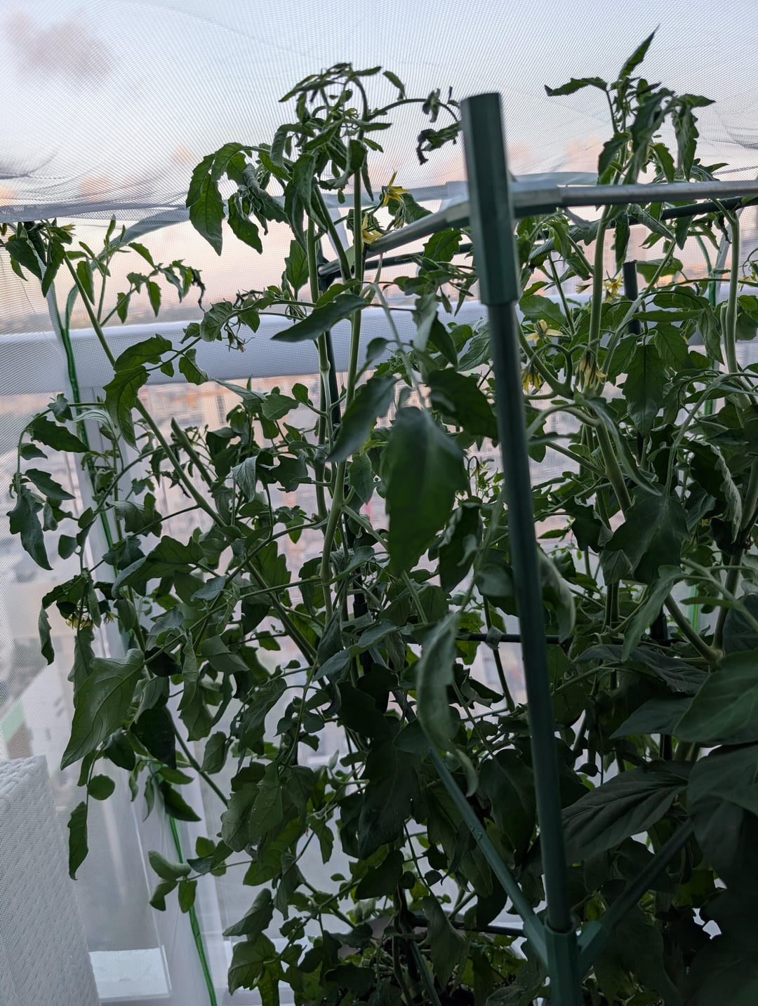 I used to garden on a 15th floor corner balcony. It was very windy. I would use a bamboo blind to wrap the container when it was too windy or hot. Try a patio hybrid variety of tomatoes next year that don’t grow so tall. I would cage these and hope for the best.