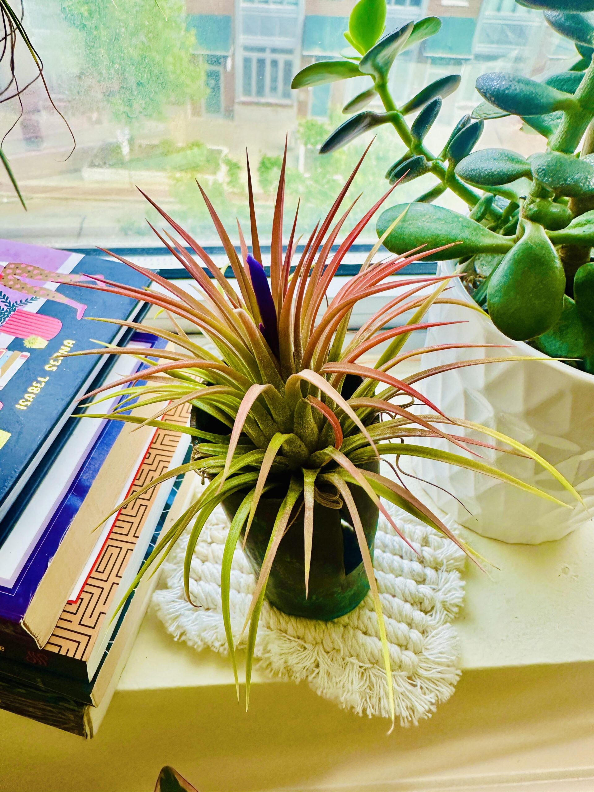 Most air plants die after blooming, but will produce baby pups after flowering. Keep the babies on the mother plant until they are minimally 1/3 the size of the mother (which will take several months). It can also take a while for the pups to show up. And don’t let the flower get wet if you want the flower to last longer.