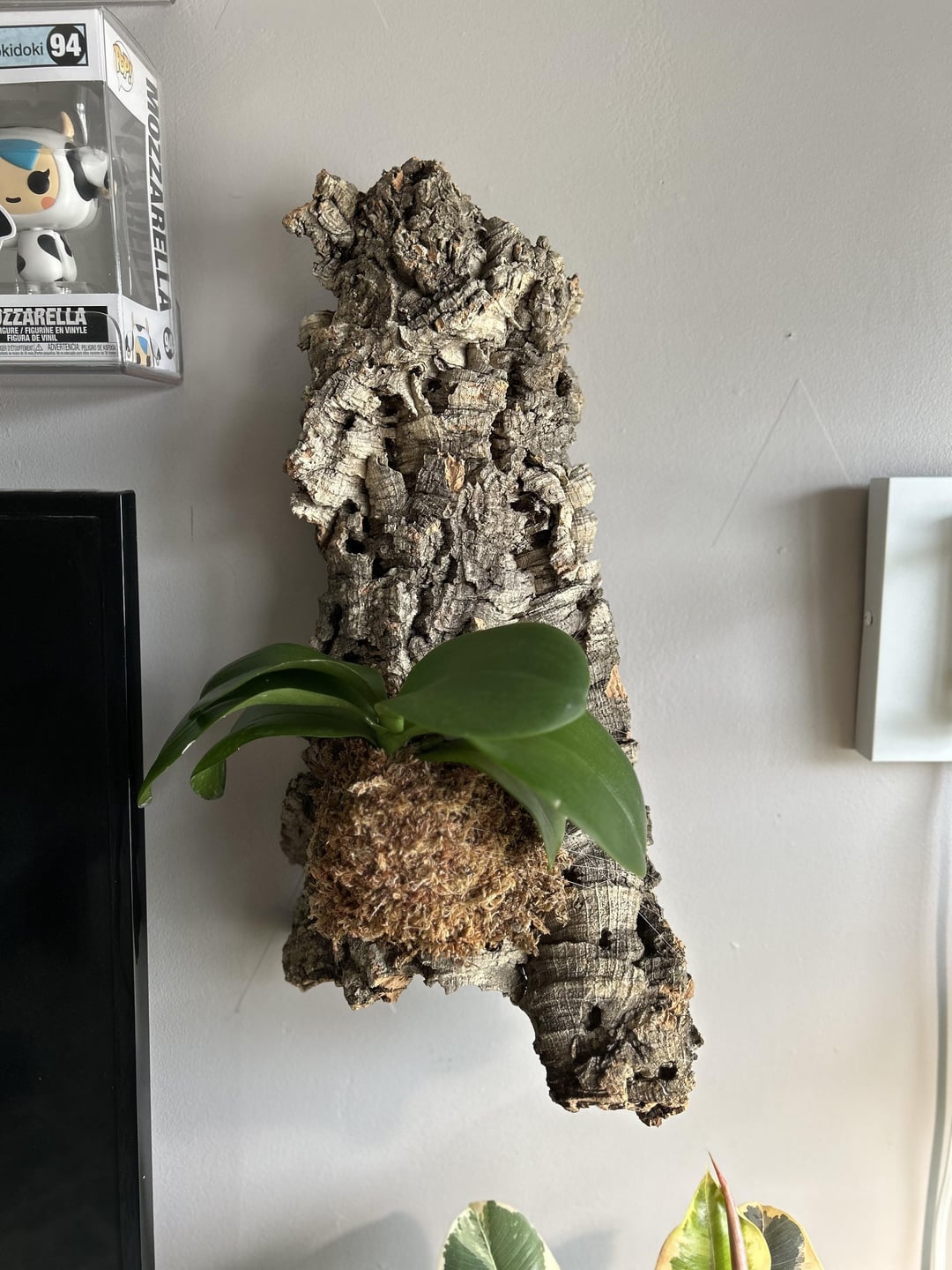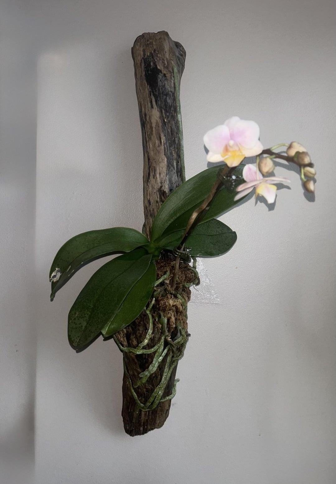 I would also recommend you try a few with the flower spike hanging, although that will require a complete chop on any spike that has already grown in the “standard” orientation. Phals in the wild will often grow with the flowers hanging basically straight down, what with nobody clipping them to little poles, and I think that would be a nice fit for this natural-style mount.
