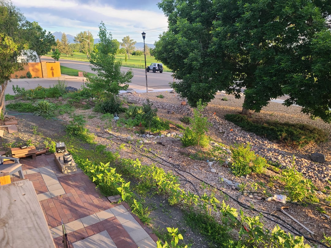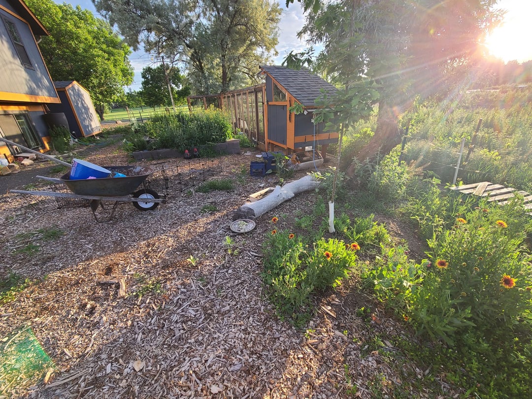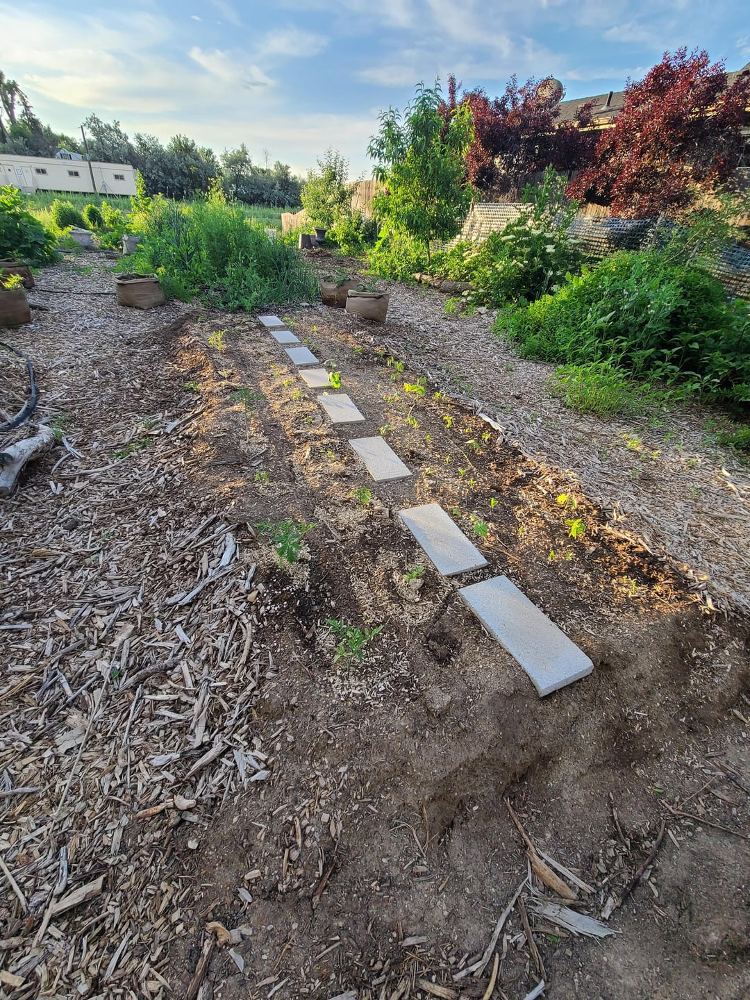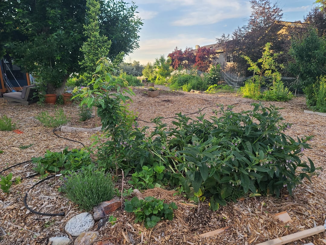 We moved in on a quarter acre a while back decommissioned the sprinkler system and trucked in wood mulch and started planting. Organized the yard into guilds based around a tree and a companion plant :