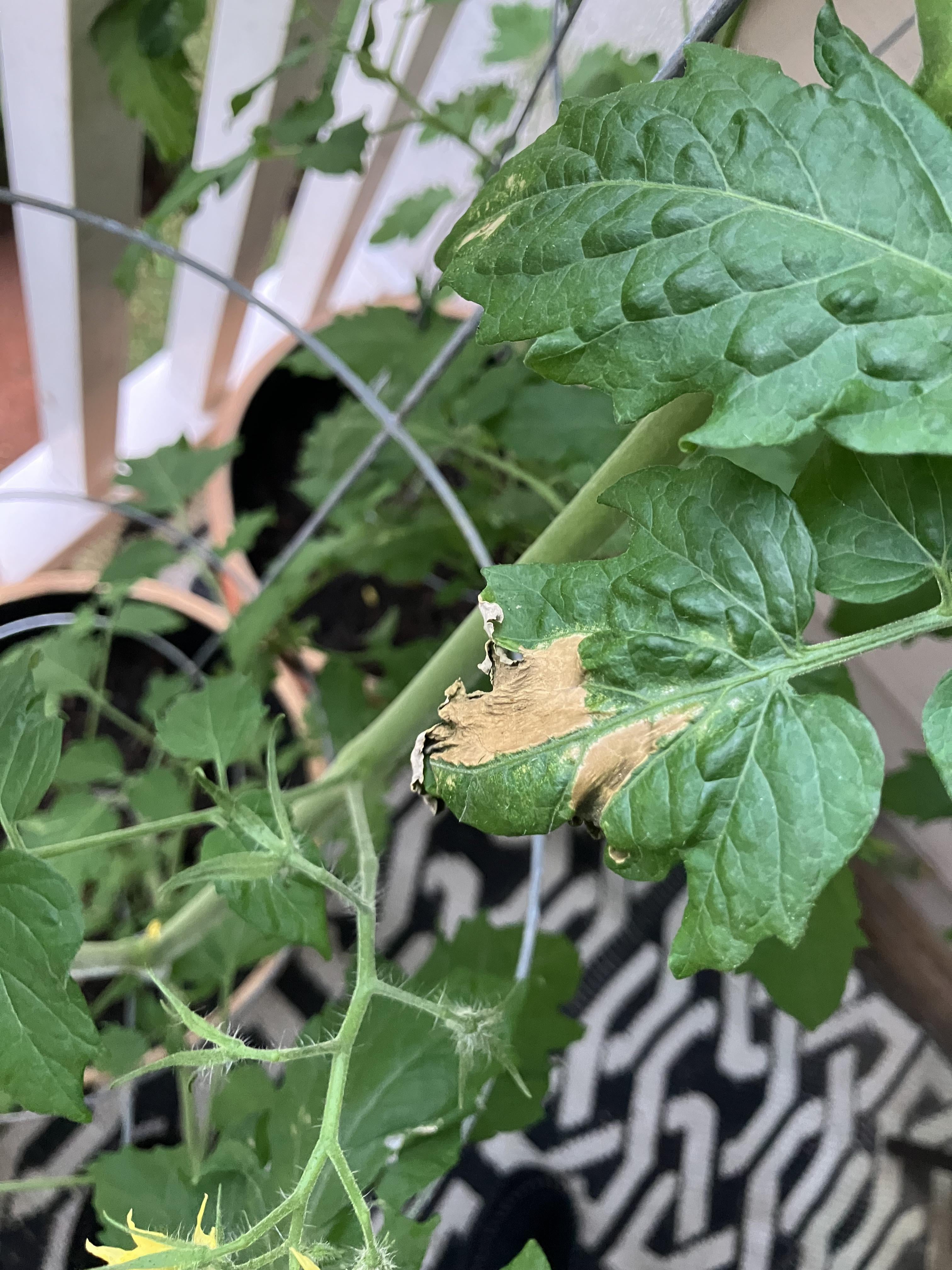 My potted tomato plant has this leaf that has wilted and turned black on the tips. I live in the Southeast of U.S. It has rained a lot in the last few weeks and my patio faces south so the sunlight isn’t overly powerful. If anyone can shed any light on my issue I would be very grateful. Thank you.