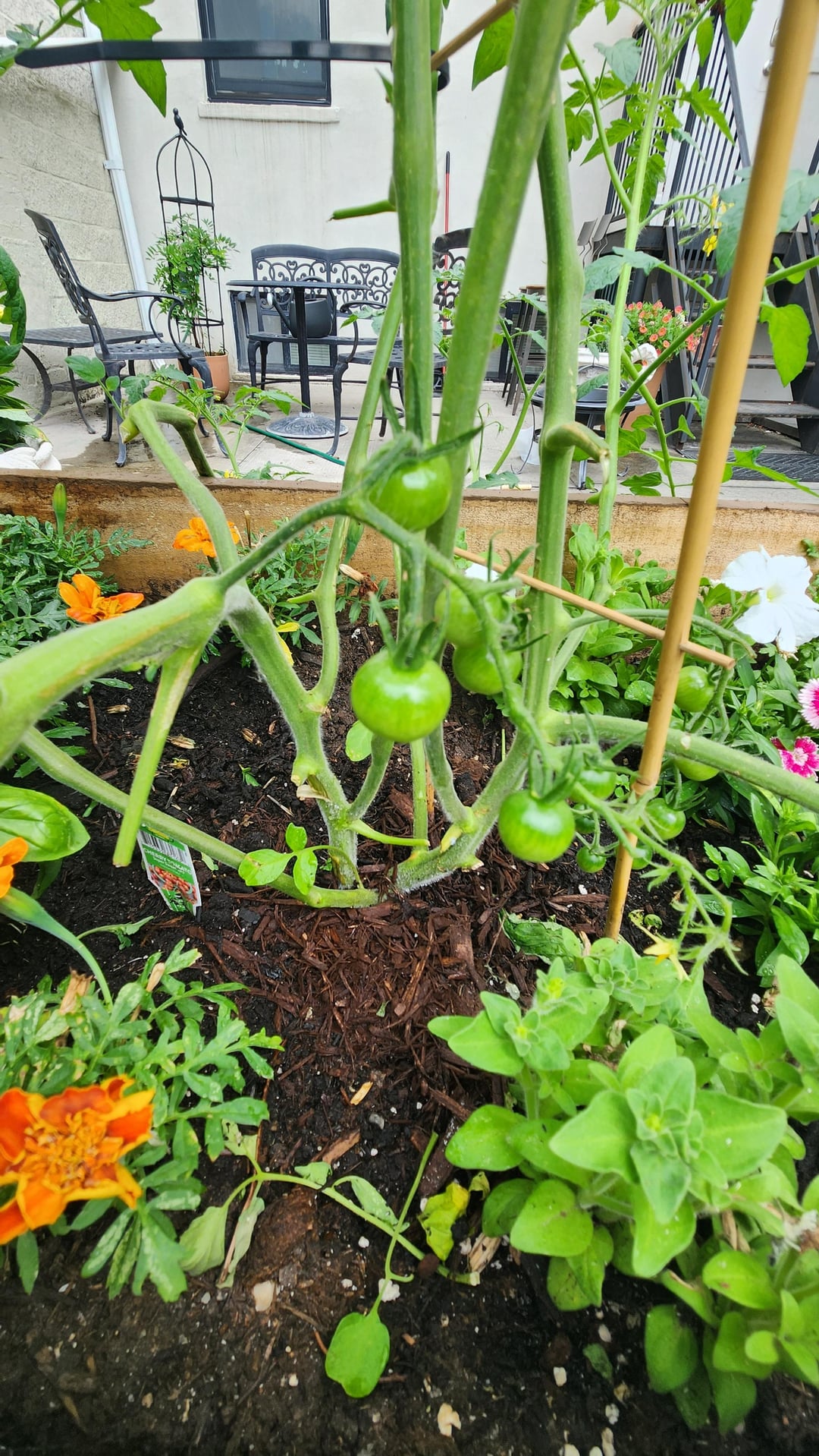 I'm growing this cherry tomato tree in a raised bed. It's growing beautifully – although a little wild. Aside for the main stem growing upward, there's a whole bunch of stems growing sideways and dropping off the bed. They have flowers and some are growing fruit. Should I leave them or cut them off to give more strength to the main stem?