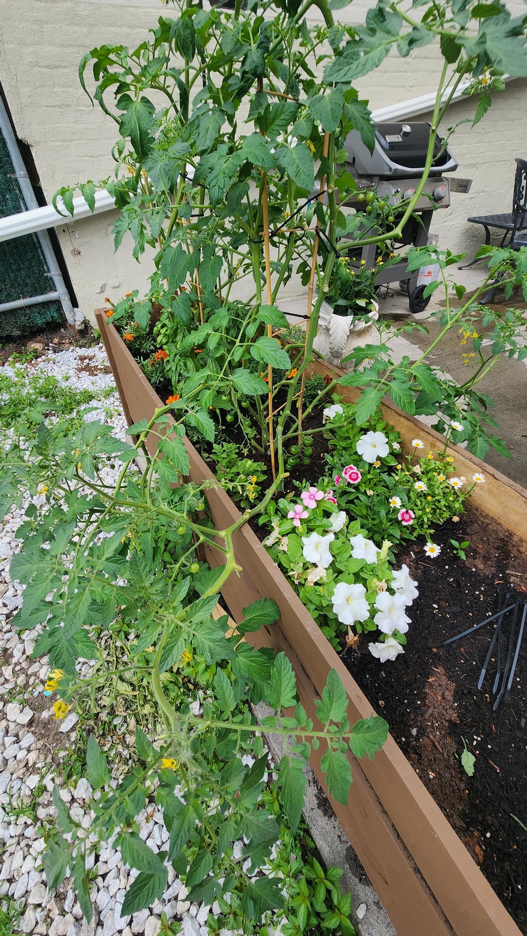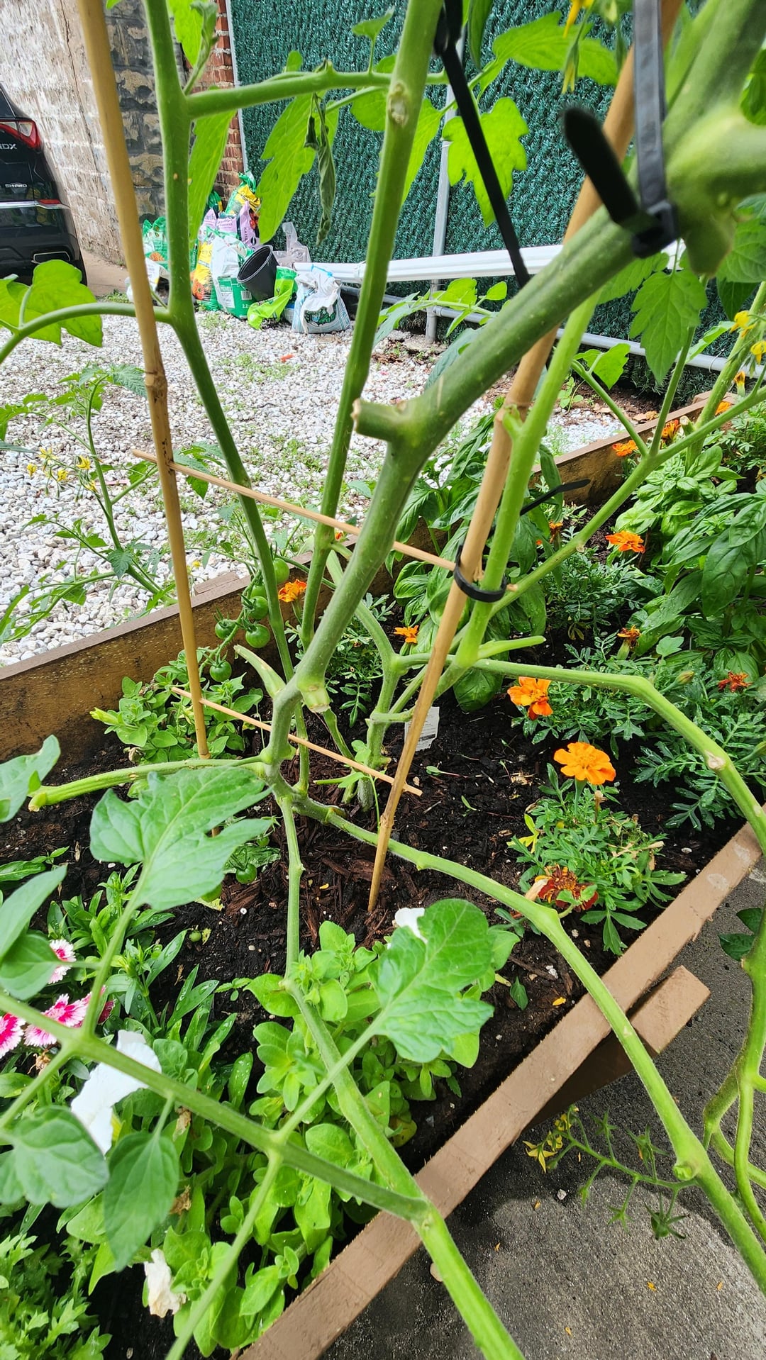 It’s just being a tomato plant. If in a larger setting, I’d stake it so sunlight and air circulate throughout. But, not sure what to do hear without damaging the stalk.