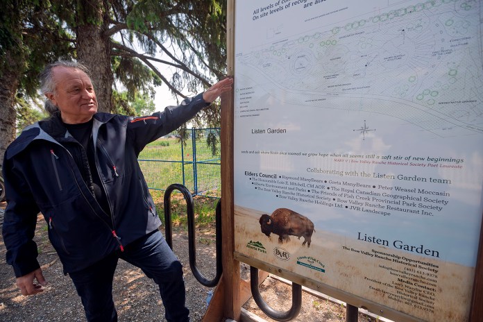 Larry Wasyliw, President of the Bow Valley Ranche Historical Society, points to the features in the new Listen Garden at Fish Creek Park in Calgary on Saturday, June 7, 2025. ARYN TOOMBS / FOR LIVEWIRE CALGARY