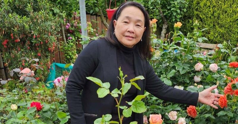 Nora Singh checking on her beautiful roses this week.