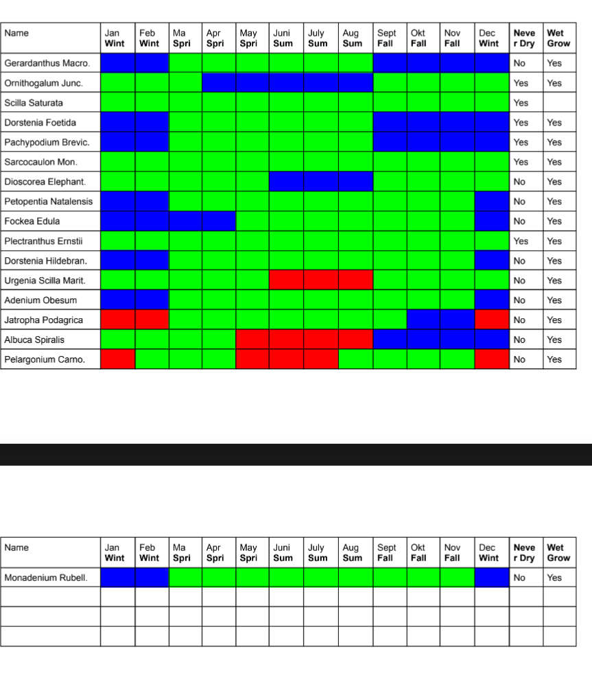 Hello, after doing some more groundwork and printing out information regarding all my plants I have made a color coded table for watering and I was wondering if I could get some input / checks from people more experienced.