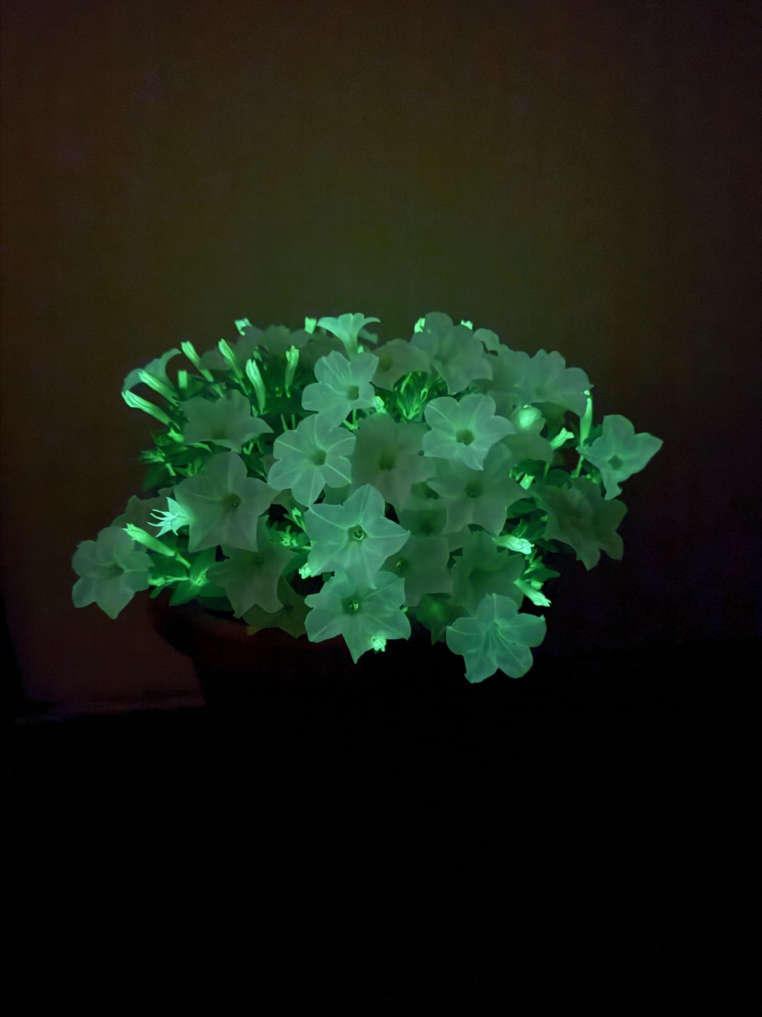 Bought these “Firefly Petunias” and finally thought to bring them into a truly dark area to bring out their glow. It’s super visible and impressive in real life, even with some ambient light! Such a cool plant.