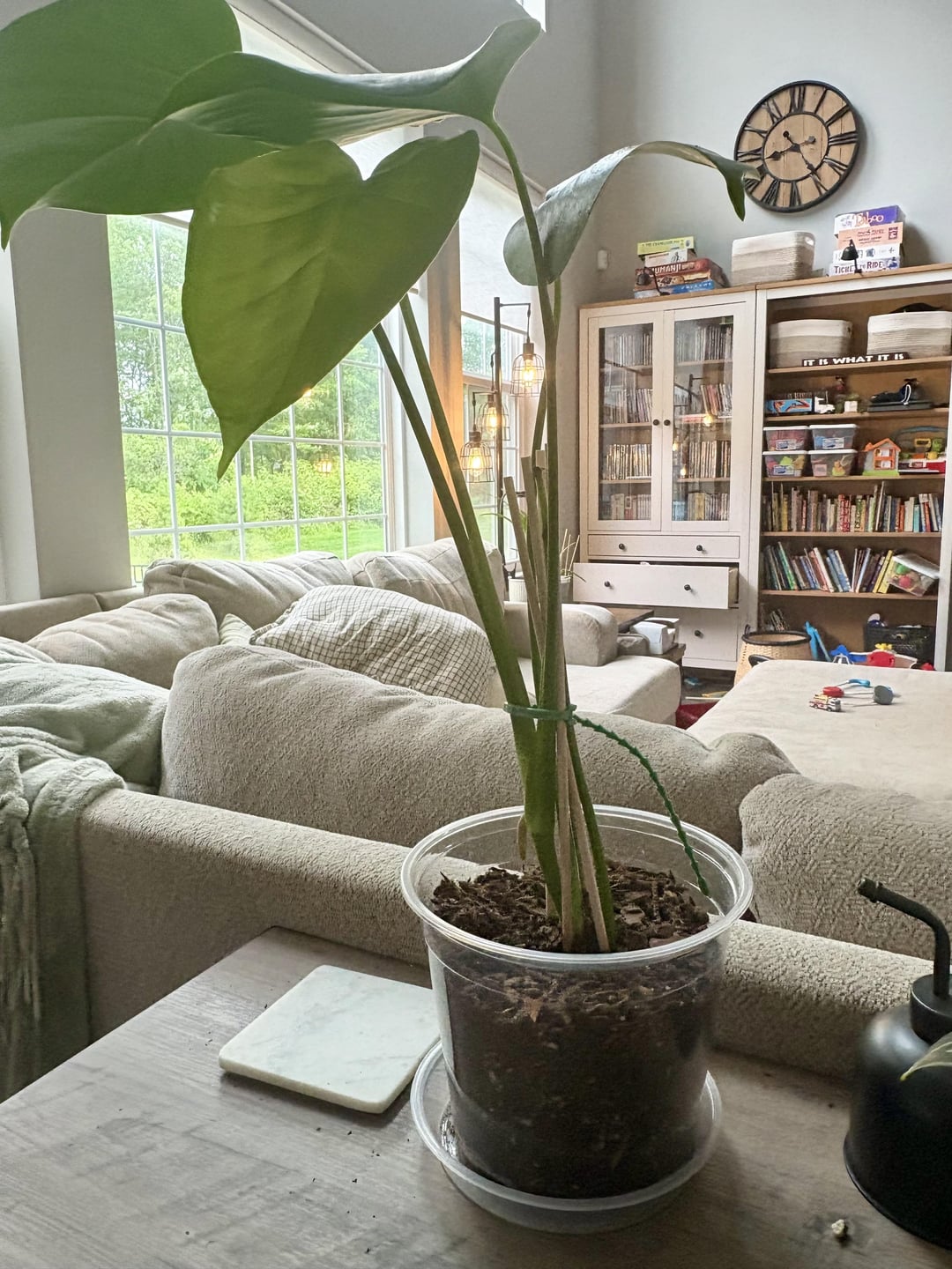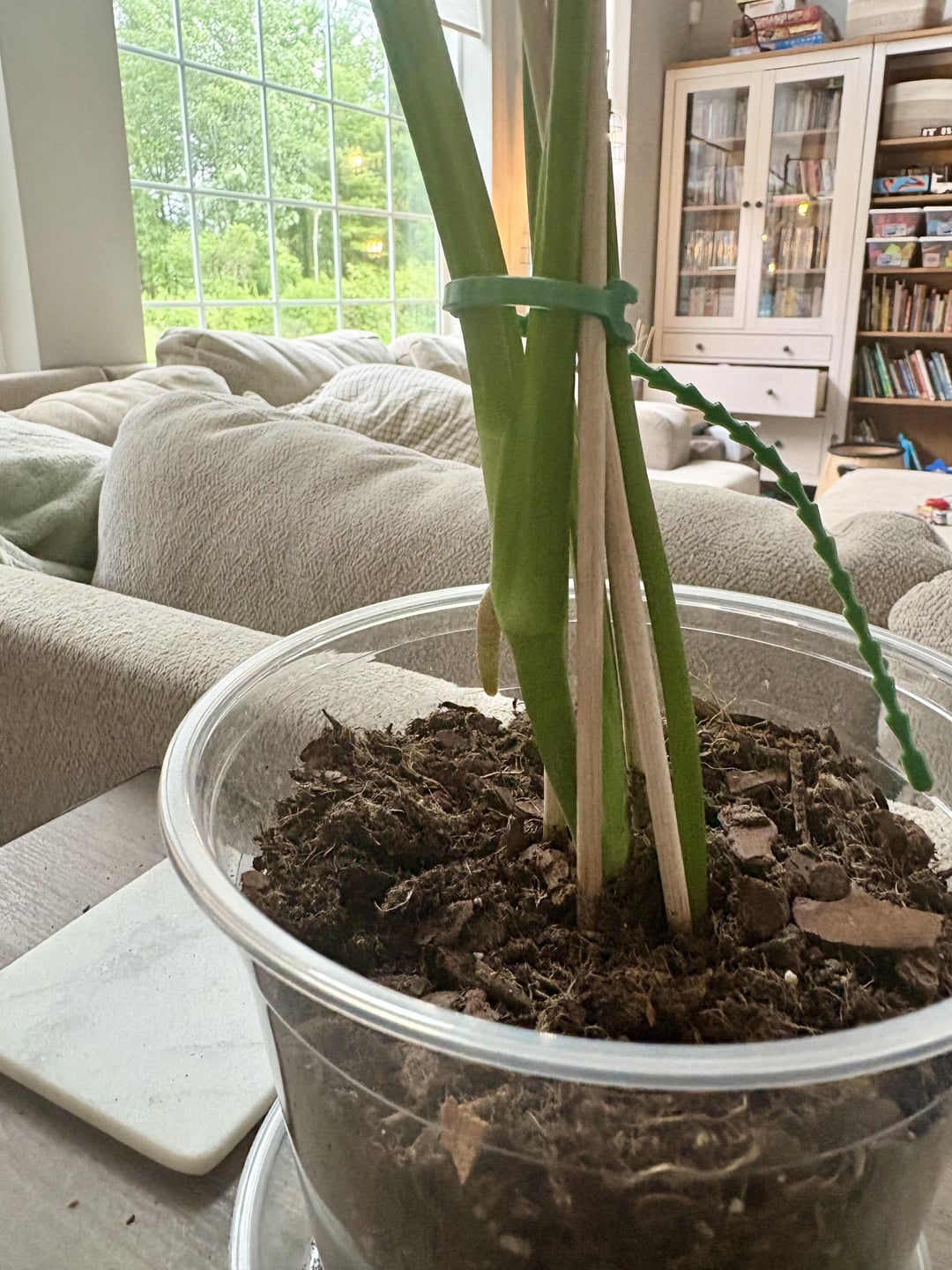 Don’t tie up your monstera like that. They need freedom to move the leaves with the sun! Remove the support