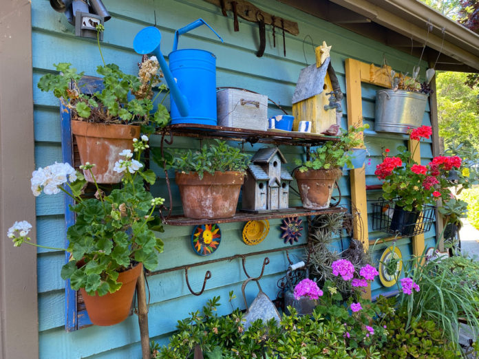 When you first enter this garden and are greeted by Kate’s English springer spaniel puppy “Buddy,” you walk past the storage shed. Now this isn’t just any ol’ shed. Kate is a yard sale shopper extraordinaire and it is decorated with repainted watering cans, vintage gardening tools and wall art, bird houses and pots of all sizes, shapes and colors.